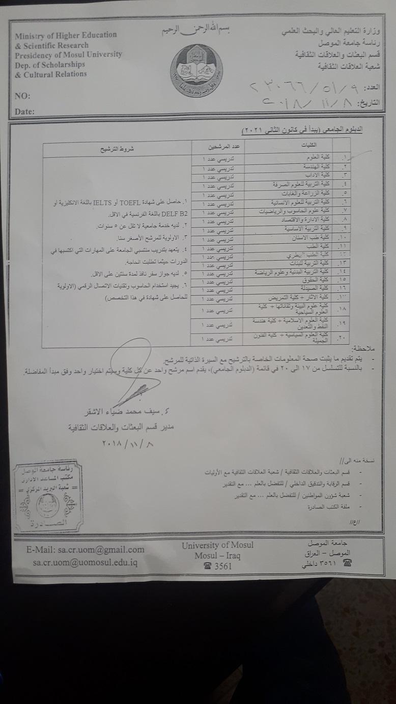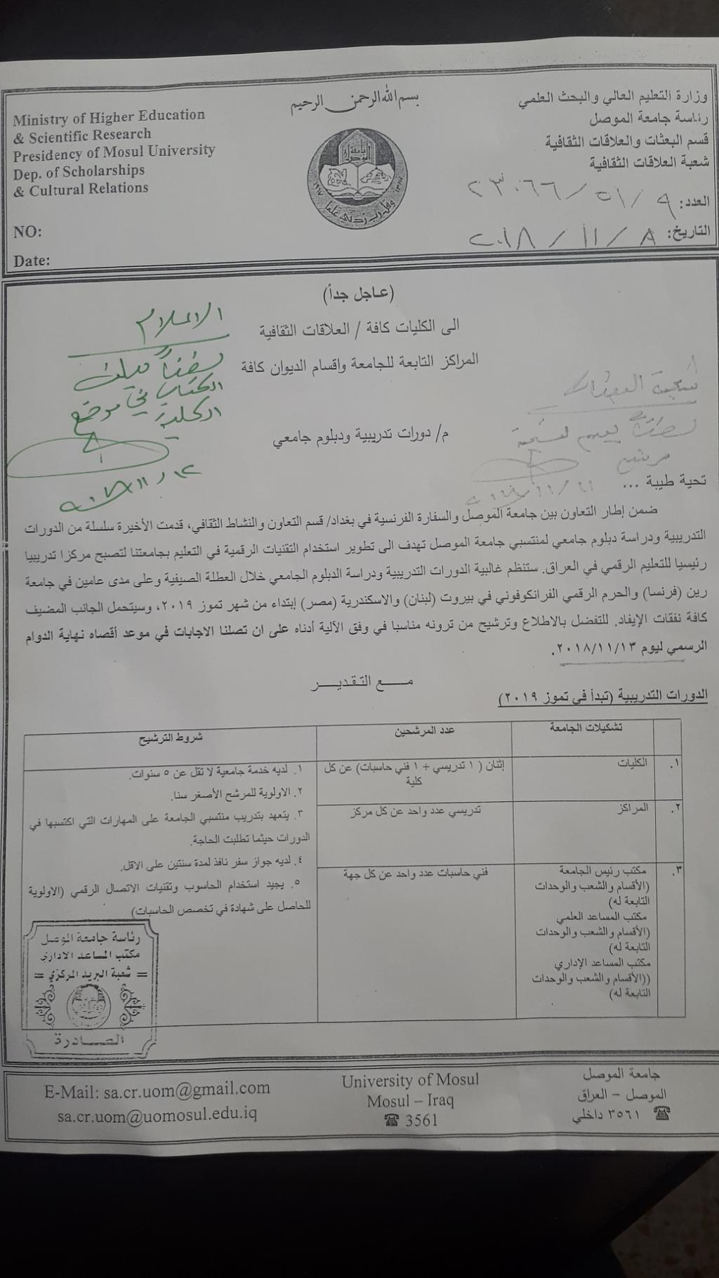 ضمن إطار التعاون بين جامعة الموصل والسفارة الفرنسية ,ستنظم السفارة عدد من الدورات التدريبية ودراسة الدبلوم العالي خلال العطلة الصيفية وعلى مدى عامين في جامعة رين (فرنسا) والحرم الرقمي الفرانكوفوني في بيروت والاسكندرية