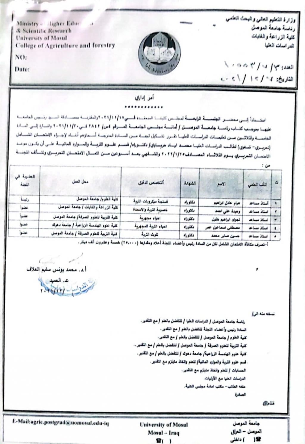 بناءًا على توجيهات السيد رئيس جامعة الموصل الأستاذ الدكتور قصي كمال الدين الأحمدي المحترم في تعزيز التعاون العلمي بين الكليات في جامعة الموصل .ترأست السيدة عميد الكلية الأستاذ المساعد الدكتورة هيام عادل إبراهيم المحترمة لجنة الإمتحان الشامل ( تحريري – شفهي ) لطالب الدكتوراه ( محمد أياد حرباوي ) من كلية الزراعة والغابات في جامعة الموصل / قسم علوم التربة و الموارد المائية .