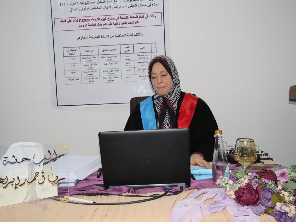 ترأست السيدة عميد كلية العلوم الأستاذ المساعد الدكتورة هيام عادل الطائي المحترمة يوم الأربعاء الموافق 29 كانون الأول 2021 لجنة مناقشة رسالة الماجستير للطالبة ( ربا أحمد إبراهيم ) من كلية الطب في جامعة الموصل حضر جانباً منها الأستاذ الدكتور باسل محمد سعيد نذير عميد كلية الطب و الموسومة “مستوى مصل الانترلوكين – 6 مع تعدد اشكال النكليوتايد المفرد -174 G/C في محفزه الجيني لدى المرضى المصابين بالتهاب المفاصل الرثوي/ العراق” .هدفت الدراسة إلى تقييم مستويات الانترلوكين السادس في امصال المرضى المصابين بداء المفاصل الرثوي مع دراسة تعدد اشكال النكليوتايد المفرد -174 G/C فٙي محفزه الجيني كعامل خطورة محتمل للإصابة بالمرض اضافة الى دراسة أي ارتباط بين الانترلوكين السادس ٛمع معايير أخرى كالجنس والعمر والشدة السريرية للمرض.وخلصت أن مستوى الانترلوكين السادس في امصال المرضى المصابين بداء المفاصل الرثوي أعلى بكثير من مستوياتها بين الناس الطبيعيين. بينما لم تدعم الدراسة دور تعدد اشكال النكليوتايد المفرد – 174 G/C في المحفز الجيني كعامل خطورة محتمل لنشوء المرض .