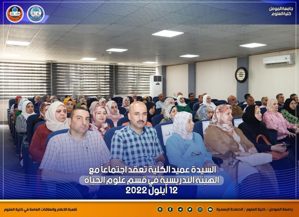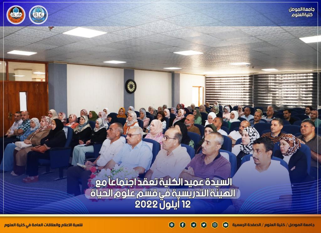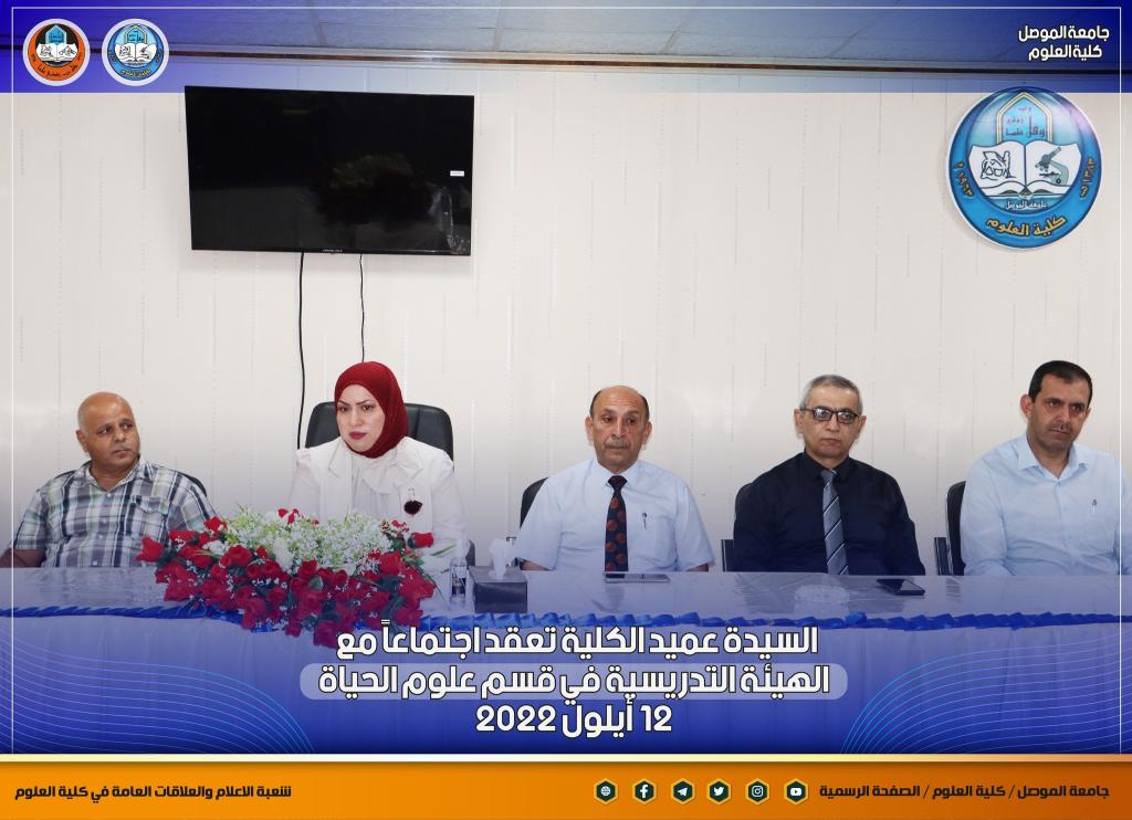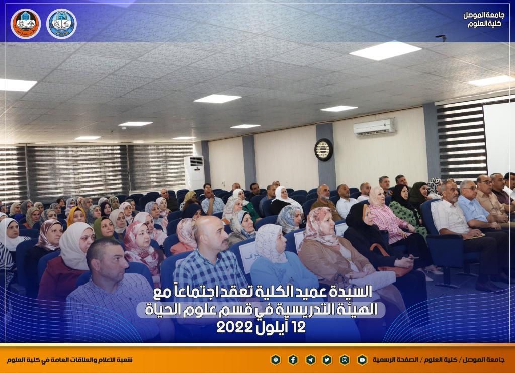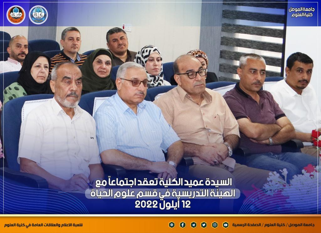 بمناسبة انطلاقة عامٍ دراسيٍ جديدٍ ومباشرة أعضاء الهيئة التدريسية في أقسام الكلية ، عقدت السيدة عميد كلية العلوم الأستاذ الدكتورة هيام عادل إبراهيم اجتماعاً جديداً مع أعضاء الهيئة التدريسية في قسم علوم الحياة بحضور السيدان معاوني العميد والسيد رئيس القسم ، والسيد ممثل نقابة الأكاديميين في الكلية.بدأت السيدة العميد حديثها بالتهنئة المباركة للسادة التدريسيين بمناسبة حلول العام الدراسي الجديد ، وضرورة التأكيد على توجيهات الوزارة و رئاسة جامعة الموصل بشأن العام الدراسي الجديد من حيث الدوام الحضوري الكامل ومتطلبات العملية التعليمية وتركز حديثها بهذا الجانب على ضرورة تحديث المناهج الدراسية لطلبة الدراستين الأولية والعليا لضمان الاستفادة المثلى للطلبة ، كما أكدت كذلك على المضي قدماً بالجانب البحثي للكادر التدريسي ونشر البحوث في المستوعبات العالمية للتقدم أكثر في سلم الترقية العلمية ، طرحت كذلك العديد من المواضيع التي من شأنها أن تصب في مصلحة الكادر التدريسي و الطلبة.شعبة الإعلام والعلاقات العامةالإثنين 12 أيلول 2022