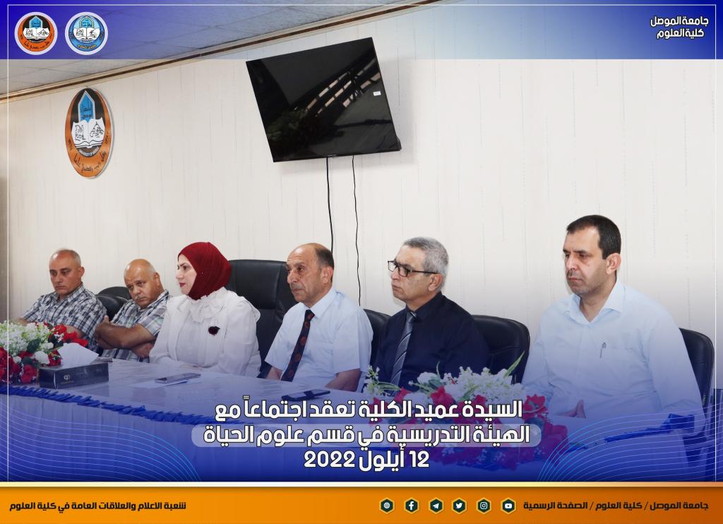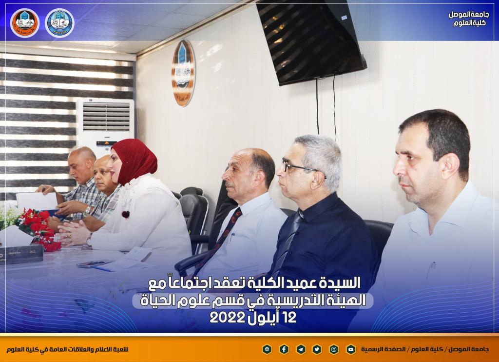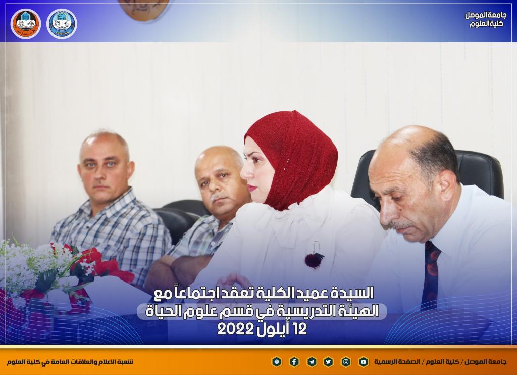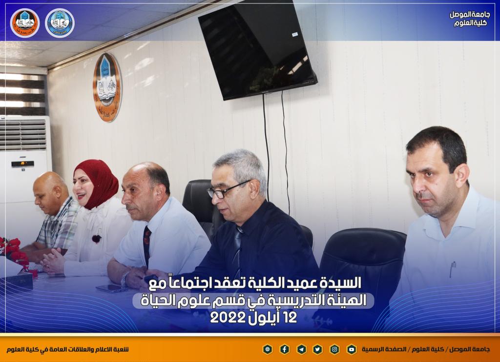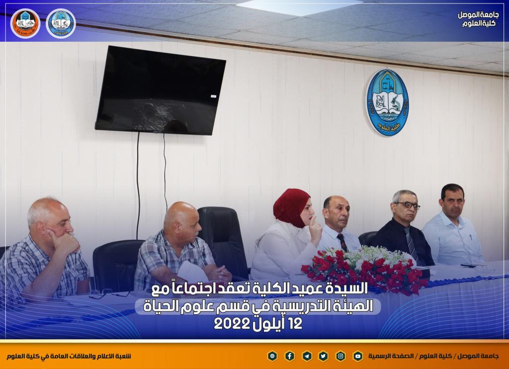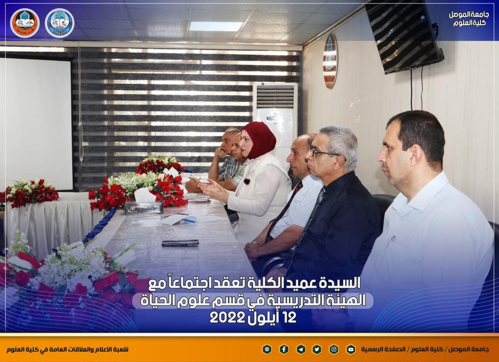 بمناسبة انطلاقة عامٍ دراسيٍ جديدٍ ومباشرة أعضاء الهيئة التدريسية في أقسام الكلية ، عقدت السيدة عميد كلية العلوم الأستاذ الدكتورة هيام عادل إبراهيم اجتماعاً جديداً مع أعضاء الهيئة التدريسية في قسم علوم الحياة بحضور السيدان معاوني العميد والسيد رئيس القسم ، والسيد ممثل نقابة الأكاديميين في الكلية.بدأت السيدة العميد حديثها بالتهنئة المباركة للسادة التدريسيين بمناسبة حلول العام الدراسي الجديد ، وضرورة التأكيد على توجيهات الوزارة و رئاسة جامعة الموصل بشأن العام الدراسي الجديد من حيث الدوام الحضوري الكامل ومتطلبات العملية التعليمية وتركز حديثها بهذا الجانب على ضرورة تحديث المناهج الدراسية لطلبة الدراستين الأولية والعليا لضمان الاستفادة المثلى للطلبة ، كما أكدت كذلك على المضي قدماً بالجانب البحثي للكادر التدريسي ونشر البحوث في المستوعبات العالمية للتقدم أكثر في سلم الترقية العلمية ، طرحت كذلك العديد من المواضيع التي من شأنها أن تصب في مصلحة الكادر التدريسي و الطلبة.شعبة الإعلام والعلاقات العامةالإثنين 12 أيلول 2022