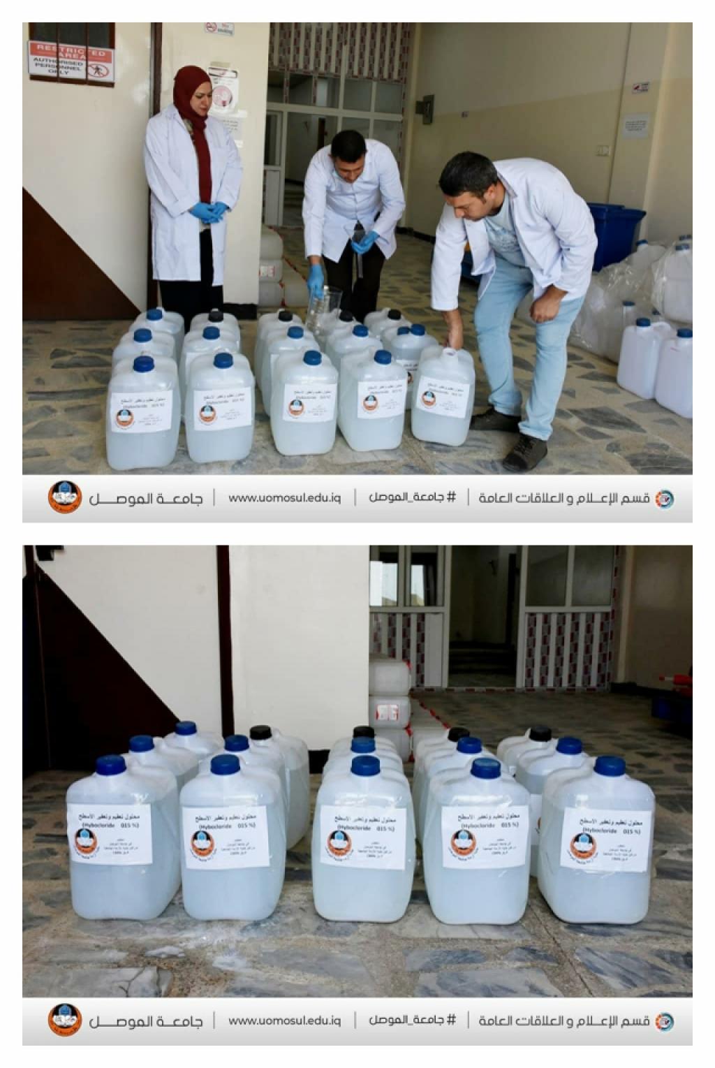 إستعداداً لإمتحانات طلبة الدراسات العليا و تهيئةً لأبنية الكليات و الأقسام الداخلية في حالة إستئناف الدوام و بمتابعة حثيثة من السيد رئيس جامعة الموصل ، قام أعضاء من فريق الأزمة الجامعية متمثلين بالسيد مساعد رئيس جامعة الموصل للشؤون الإدارية والسيدة عميد كلية العلوم و مسؤول فريق ال CBRN الجامعي ، بتحضير مواد تعقيم و تعفير للقاعات ، و تقديم الدعم بمواد أولية بسيطة و بتكاليف قليلة ، من أجل القيام بتعفير أبنية و منشآت الجامعة و الدوائر الحكومية بشكل دوري ؛ لخلق بيئة صحية آمنة لمنتسبيها .