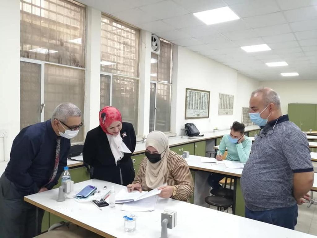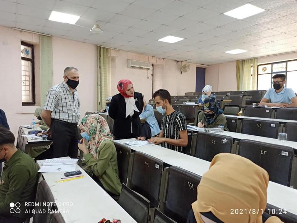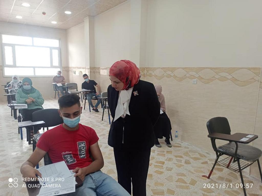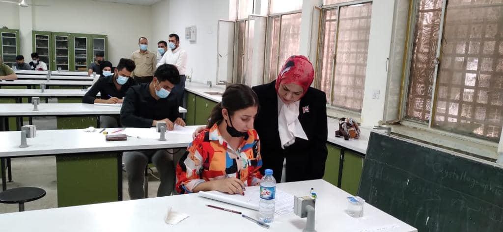 استناداً الى توجيهات وزارة التعليم العالي والبحث العلمي ورئاسة جامعة الموصل بخصوص المتابعة المستمرة لسير الإمتحانات النهائية الإلكترونية والحضورية في أقسام الكلية.تفقدت السيدة عميد الكلية الأستاذ المساعد الدكتورة هيام عادل الطائي يرافقها السيد المعاون العلمي الأستاذ المساعد الدكتور محمد صبحي حميد سير العملية الإمتحانية في أقسام الكلية صباح يوم الاحد الموافق 1 آب 2021، حيث شهد هذا اليوم انطلاق الإمتحانات الحضورية في بعض أقسام الكلية مع استمرار الامتحانات الحضورية لطلبة الدراسات العليا و الامتحانات الالكترونية لطلبة الدراسات الأولية في مراحل وأقسام أخرى ، وتحدثت السيدة العميد خلال جولتها مع السادة رؤساء الأقسام عن الاجراءات الصحية المتخذة مع الاطلاع على المعوقات التي تواجههم بغية ايجاد السبل المناسبة لتذليلها ، كما تحدثت مع مجموعة من طلبة الأقسام للاطلاع على احتياجاتهم و آراءهم حول نماذج الأسئلة الإمتحانية والمعوقات التي تواجههم للعمل على تذليلها في سبيل اكمال العملية الإمتحانية بشكل سلس و انهاء متطلبات العام الدراسي الحالي .متمنين لطلبتنا الأعزاء دوام الموفقية والنجاح وأن يبعد عنهم كل وباء.