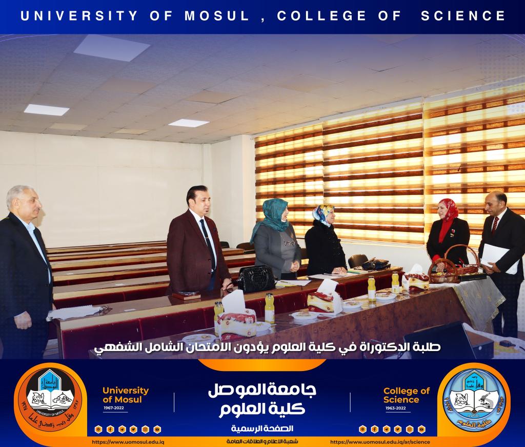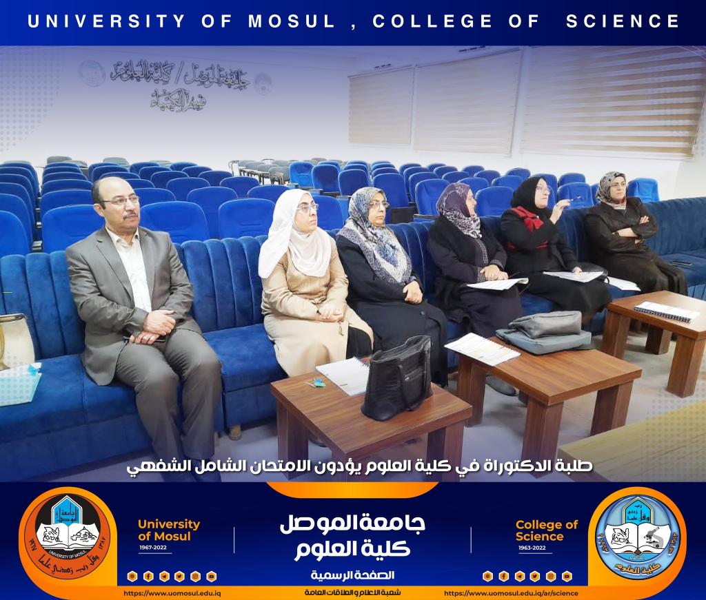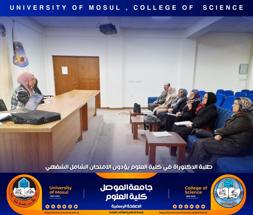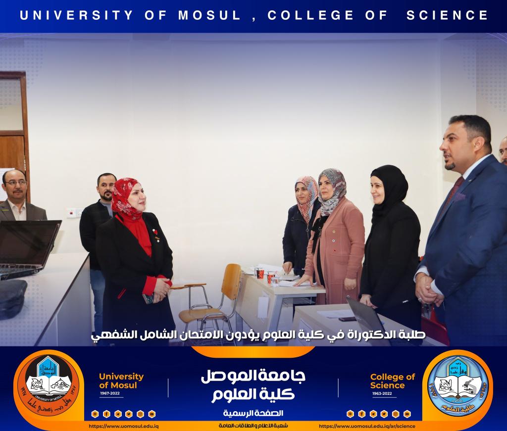 تفقدت السيدة عميد الكلية الأستاذ الدكتورة هيام عادل إبراهيم سير عملية الامتحان الشفهي لطلبة الدكتوراه الذي انطلق صباح هذا اليوم الموافق للأول من كانون الأول 2022 في كل من أقسام الكيمياء و علوم الحياة و الفيزياء و علوم الأرض ، حيث أبدت دعمها الكامل لطلبتنا الاعزاء ، مثنية وشاكرة جهود اللجان المشاركة فيه من أقسام الكلية و كليات الجامعة و الاستعدادات والتحضيرات اللوجستية لأقسام الكلية قبيل الامتحان التي أدت الى سيره بصورة سلسة.تمنياتنا لطلبتنا التوفيق الدائمشعبة الإعلام و العلاقات العامةالخميس 1 كانون الأول 2022