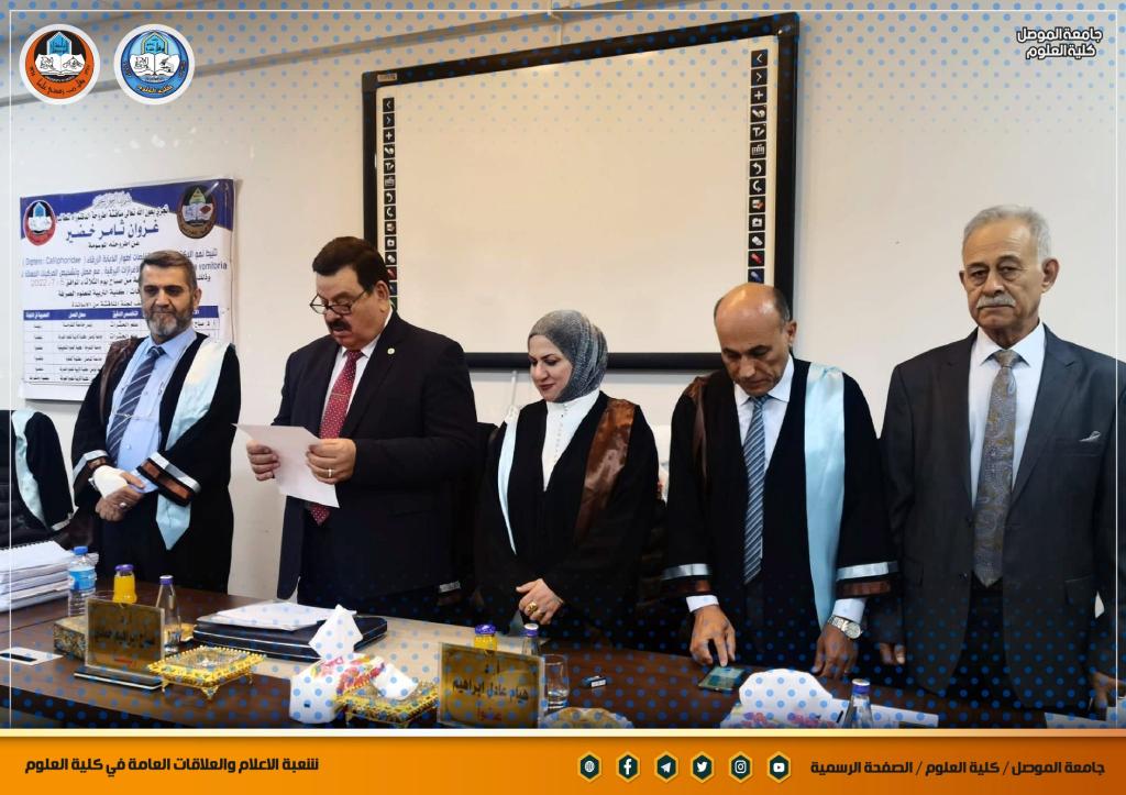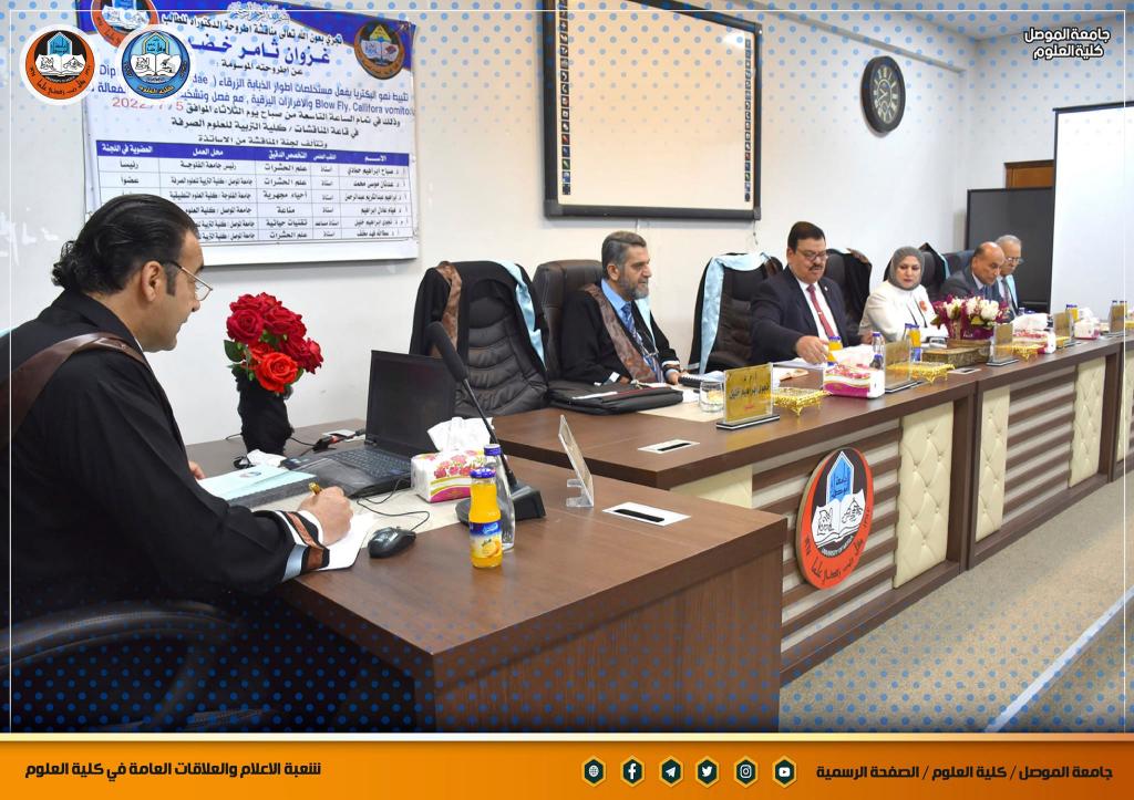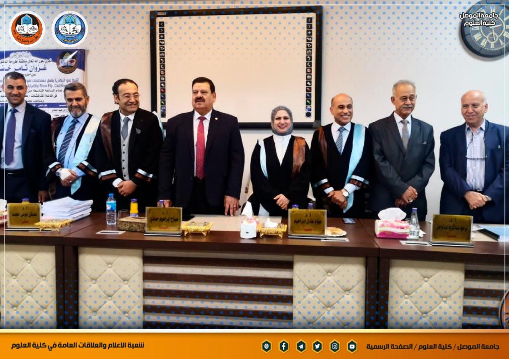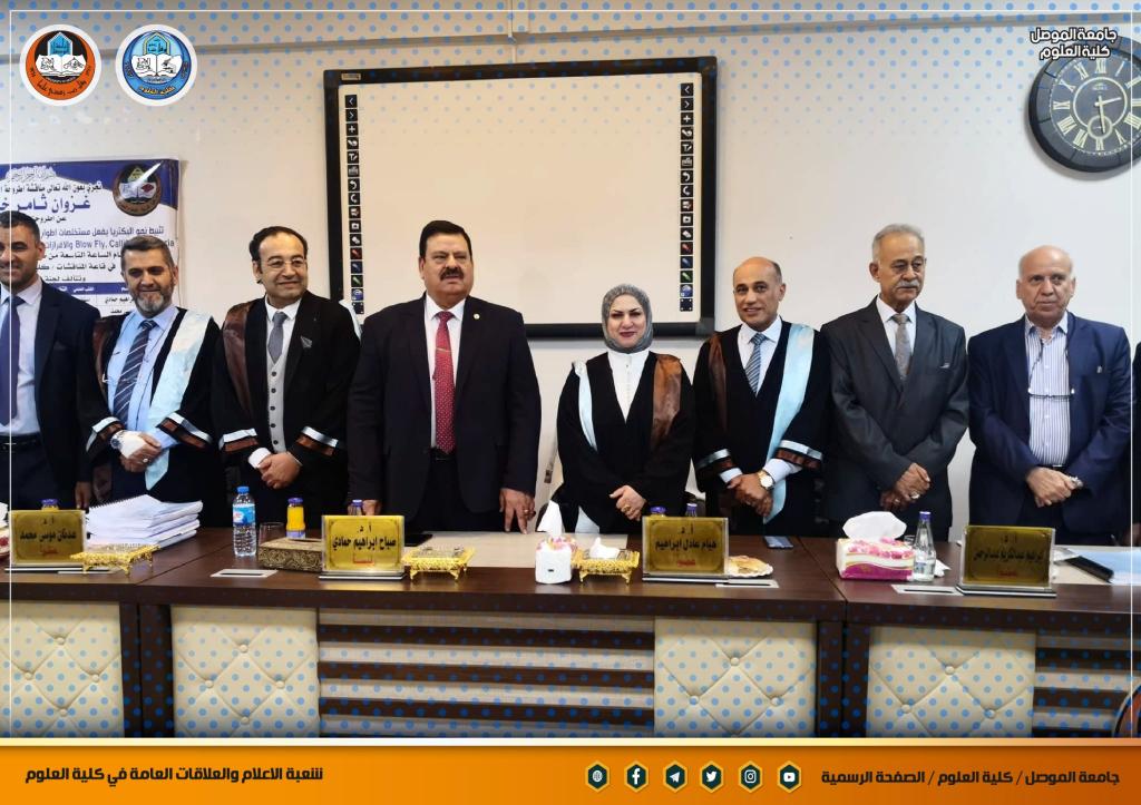 شاركت السيدة عميد كلية العلوم الأستاذ الدكتورة هيام عادل إبراهيم المحترمة في عضوية لجنة مناقشة اطروحة الدكتوراه للطالب (غزوان ثامر خضير الراشدي) من قسم علوم الحياة / كلية التربية للعلوم الصرفة / جامعة الموصل .ترأس اللجنة الأستاذ الدكتور صباح إبراهيم حمادي رئيس جامعة الفلوجة المحترم ، و وسمت الاطروحة التي حضر مناقشتها السيد رئيس جامعة الموصل الأستاذ الدكتور قصي كمال الدين الأحمدي المحترم والسيد المساعد العلمي الأستاذ الدكتور منير سالم طه المحترم وعدد من تدريسي الكلية ” تثبيط نمو البكتيريا بفعل مستخلصات اطوار الذبابة الزرقاء Blow Fly، Calliphora vomitoria (Diptera: Calliphoridae) والافرازات اليرقية، مع فصل وتشخيص المركبات الفعالة لها “دارت أحداثها صباح يوم الثلاثاء الموافق 5 تموز 2022 على قاعة المناقشات في الكلية.تمنياتنا لمنتسبي الكلية بالتوفيق و العطاء الدائم