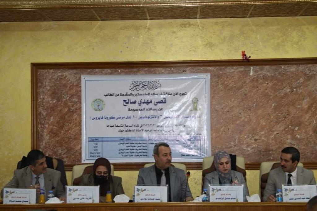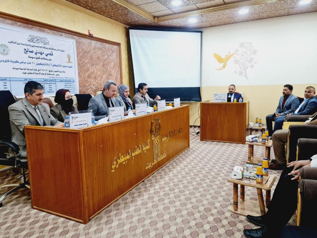 شاركت السيدة العميد الأستاذ الدكتورة هيام عادل إبراهيم في مناقشة رسالة الماجستير للطالب ( قصي مهدي صالح ) من كلية الطب البيطري في جامعة تكريت الموسومة ب ” تقييم مستوى الانترلوكين 6 والانترلوكين 10 لدى مرضى كورونا ” .المناقشة التي حظيت بحضور السيد رئيس جامعة تكريت الأستاذ الدكتور وعد محمود رؤوف المحترم جرت صباح يوم الخميس الموافق 31 آذار 2022 على قاعة الأستاذ الدكتور مهند ماهر في الكلية ، قدّم خلالها السيد رئيس الجامعة المحترم كتاب شكر للسيدة العميد لتكبدها عناء السفر ومشاركتها في المناقشة.