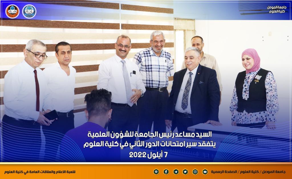 تفقد السيد مساعد رئيس الجامعة للشؤون العلمية الأستاذ الدكتور منير سالم طه سير امتحانات الدور الثاني في أقسام الكلية رافقه في الجولة السيدة عميد الكلية الأستاذ الدكتورة هيام عادل ابراهيم و السادة معاوني العميد.وقد اطلع خلال جولته على عمل اللجان الامتحانية في الأقسام مثنياً على جهودهم المبذولة في ادارة العملية الامتحانية مؤكداً في الوقت ذاته على ضرورة الالتزام بتعليمات الوزارة بشأن كتابة الماستر شيت الخاص بالطلبة.شعبة الإعلام والعلاقات العامةالأربعاء 7 أيلول 2022