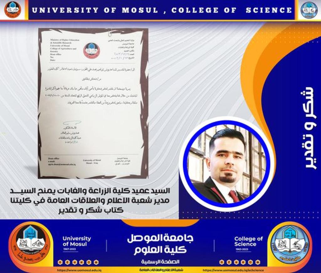 السيد عميد كلية الزراعة والغابات يمنح السيد مدير شعبة الإعلام والعلاقات العامة في كليتنا كتاب شكر و تقدير