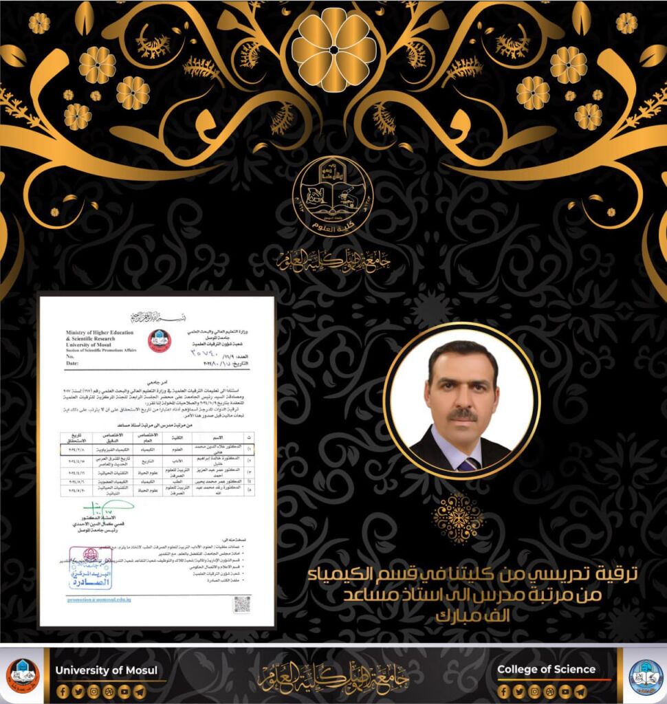 نظراً للتميز العلمي و نشر بحوثهم في مجلات عالمية رصينة مصنفة ضمن مستوعبات سكوبس و كلاريفيت ، السيد رئيس جامعة الموصل الأستاذ الدكتور قصي كمال الدين الأحمدي المحترم يمنح (32) تدريسي من كليتنا كتاب شكر و تقدير مع ما يترتب عليه من قدمٍ لمدة شهرٍ لأغراض العلاوة و الترفيع.