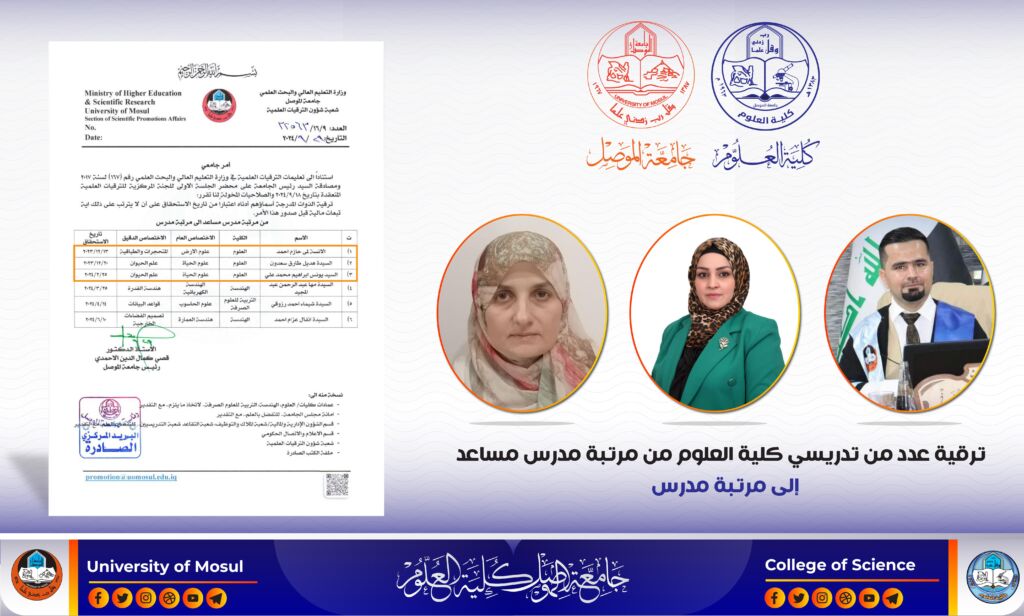 من جانبها، تتقدم أسرة كلية العلوم متمثلةً بالسيدة عميد الكلية الأستاذ الدكتورة (هيام عادل إبراهيم الطائي) المحترمة بأحر التهاني والتبريكات بهذه المناسبة، متمنيةً لكافة منتسبي كليتنا دوام الموفقية والإزدهار والرقي.