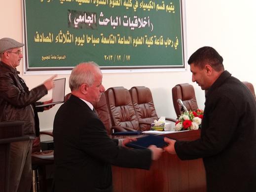 كرّم السيد رئيس قسم الكيمياء أ.د. نبيل صبيح عثمان اللجان المنظمة لأعمال الندوة العلمية الثانية " أخلاقيات الباحث الجامعي " وذلك بتوزيع شهادات تقديرية