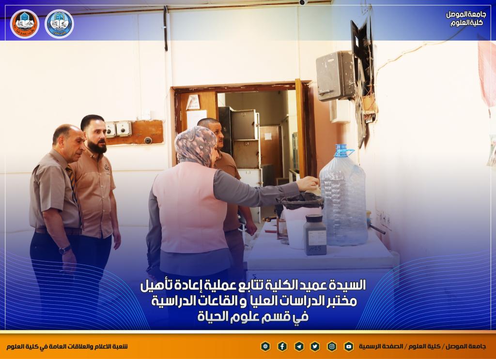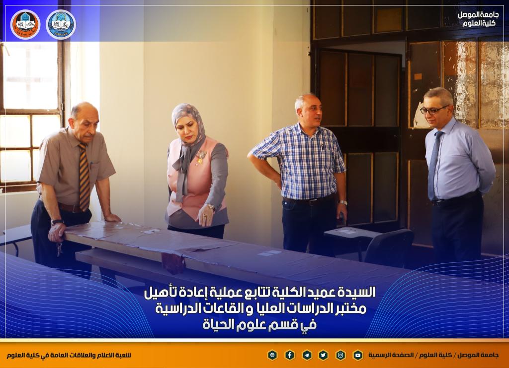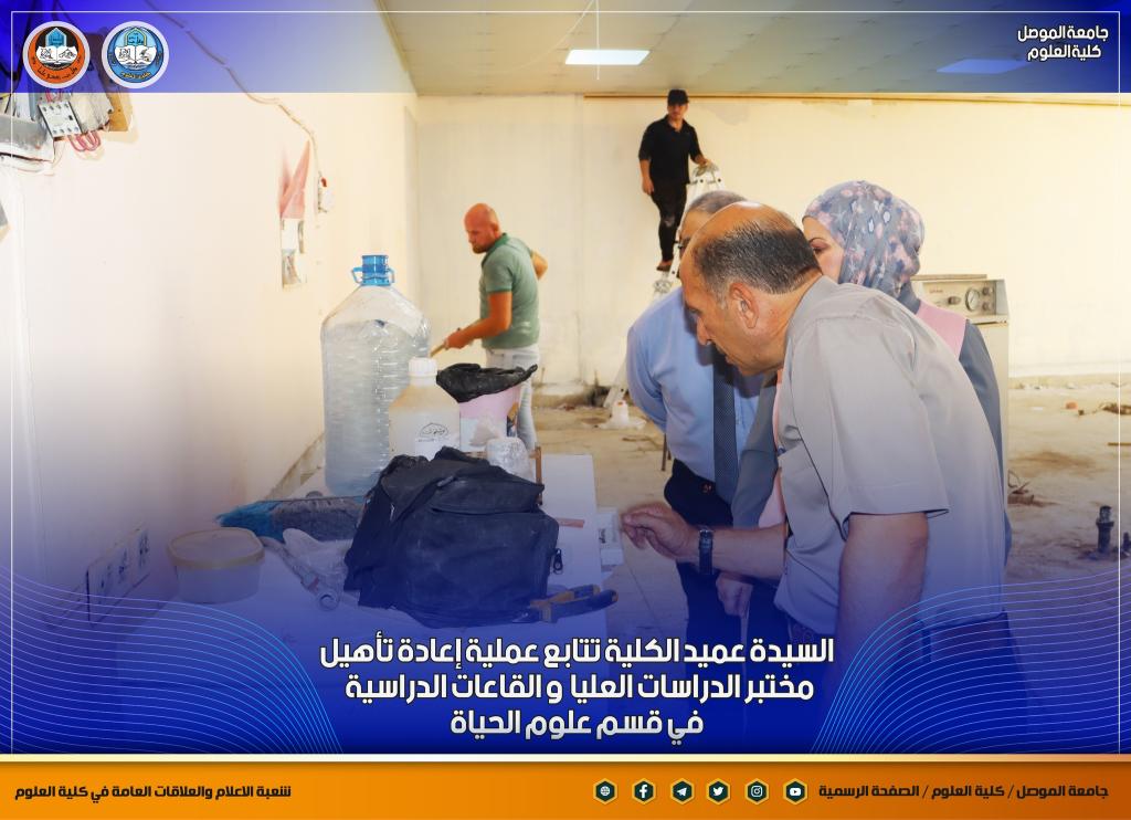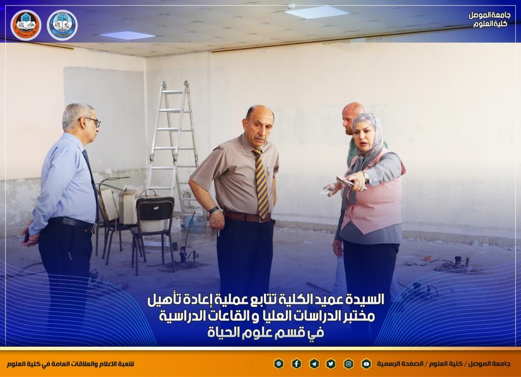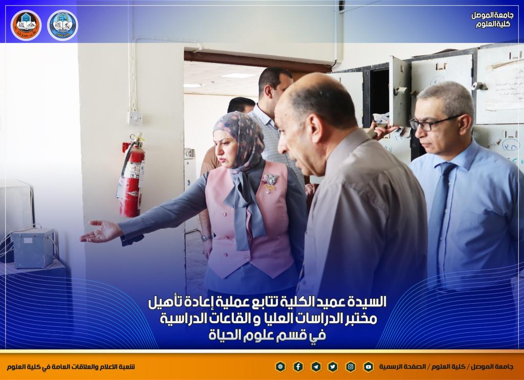 ضمن جولاتها التفقدية المستمرة لمتابعة سير عمليات الأعمار في أقسام الكلية ، أجرت السيدة عميد الكلية الأستاذ الدكتورة هيام عادل إبراهيم جولة تفقدية لقسم علوم الحياة صباح يوم الإثنين الموافق 29 آب 2022 للاطلاع على أعمال إعادة تأهيل مختبر الدراسات العليا و بعض القاعات الدراسية في القسم ، رافقها في الجولة السادة معاوني العميد و السيد رئيس القسم ، وقد شددت خلال جولتها على سرعة انجاز أعمال التأهيل لتكون متاحة لطلبة الدراسات العليا مع استمرار دراستهم العملية و قرب بدء العام الدراسي الجديد.شعبة الإعلام والعلاقات العامةالثلاثاء 30 آب 2022
