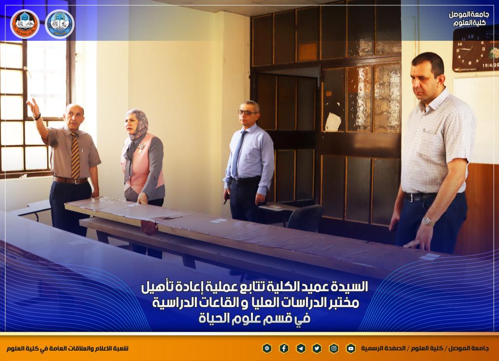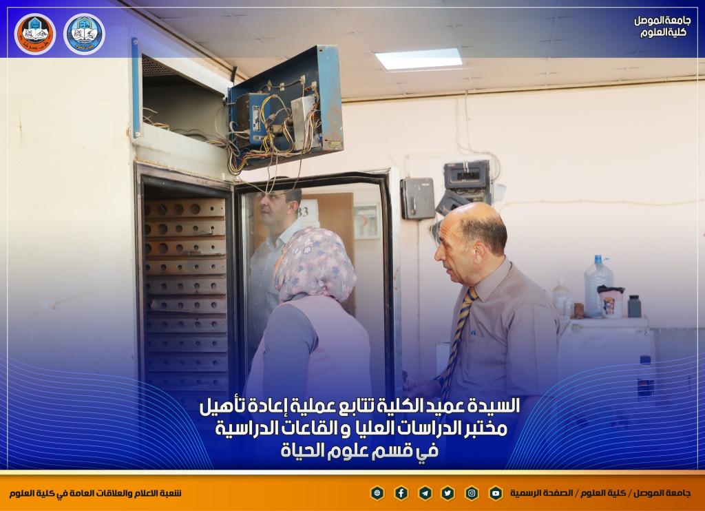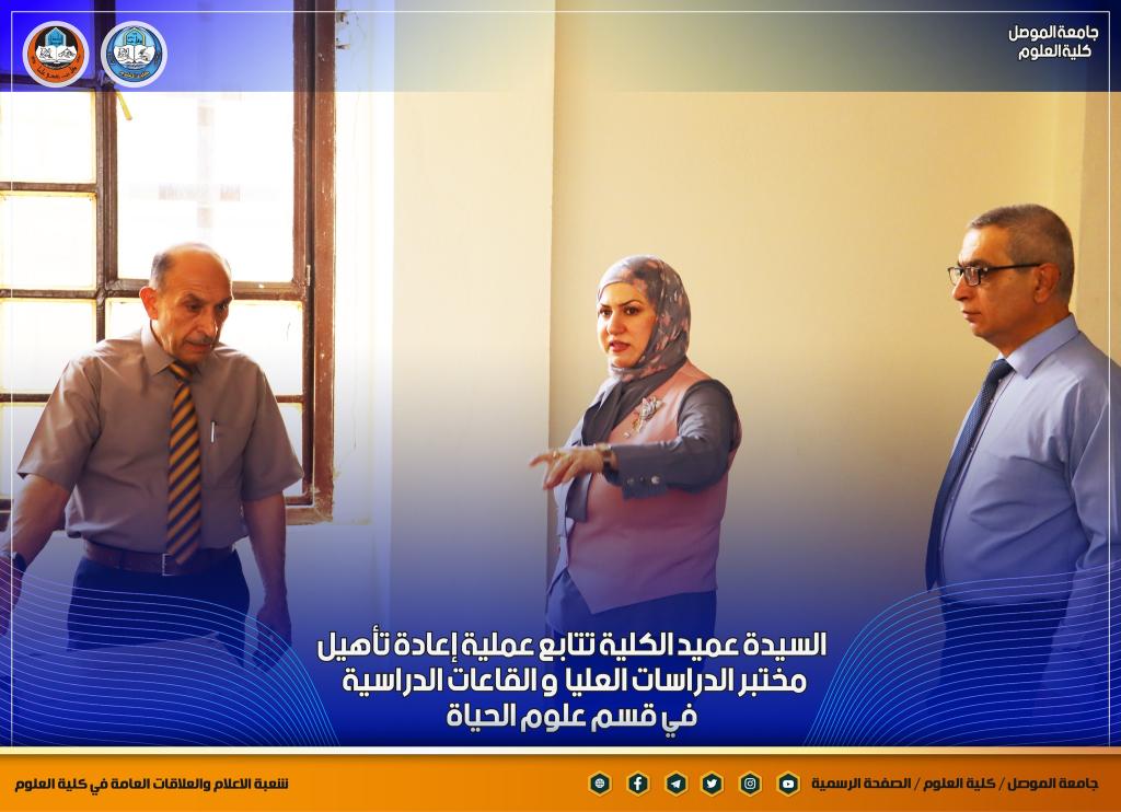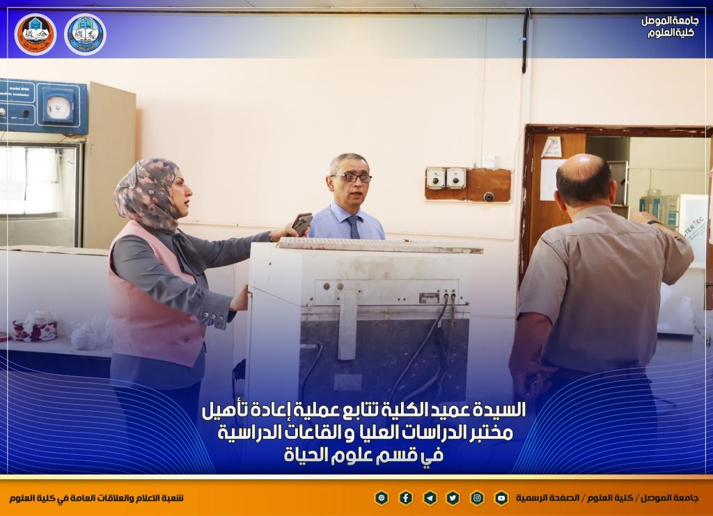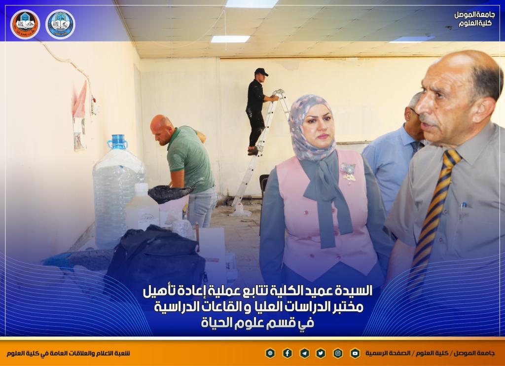ضمن جولاتها التفقدية المستمرة لمتابعة سير عمليات الأعمار في أقسام الكلية ، أجرت السيدة عميد الكلية الأستاذ الدكتورة هيام عادل إبراهيم جولة تفقدية لقسم علوم الحياة صباح يوم الإثنين الموافق 29 آب 2022 للاطلاع على أعمال إعادة تأهيل مختبر الدراسات العليا و بعض القاعات الدراسية في القسم ، رافقها في الجولة السادة معاوني العميد و السيد رئيس القسم ، وقد شددت خلال جولتها على سرعة انجاز أعمال التأهيل لتكون متاحة لطلبة الدراسات العليا مع استمرار دراستهم العملية و قرب بدء العام الدراسي الجديد.شعبة الإعلام والعلاقات العامةالثلاثاء 30 آب 2022
