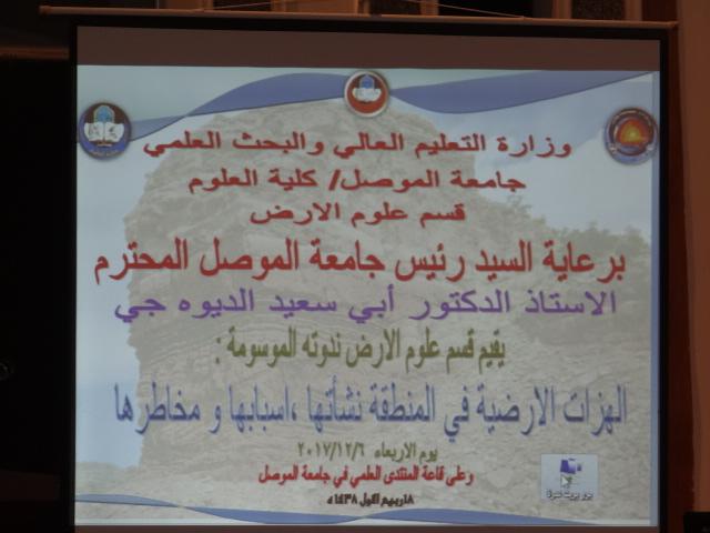 القى الاستاذ الدكتور انور مصطفى عزت الفيضي عميد كلية العلوم كلمة الافتتاح في ندوة الهزات الارضية التي نظمها قسم علوم الارض في الكلية وعلى قاعة المنتدى الادبي العلمي