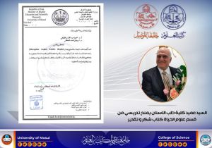 السيد عميد كلية طب الأسنان يمنح تدريسي من قسم علوم الحياة كتاب شكر و تقدير