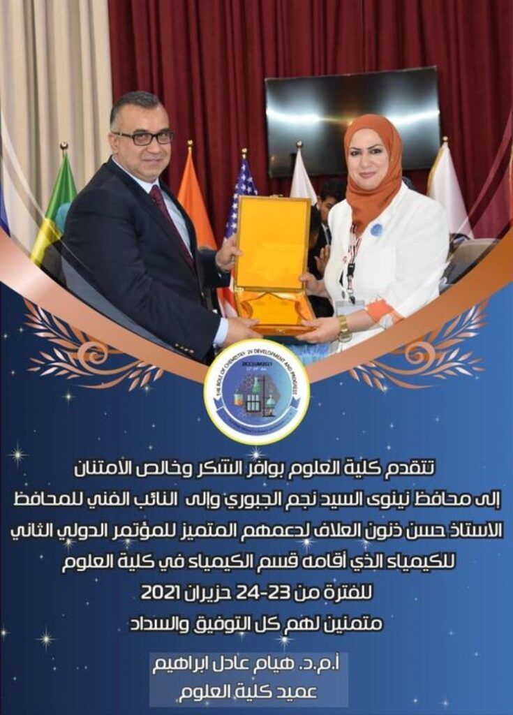ضمن أعمال اليوم الأول للمؤتمر الدولي الثاني للكيمياء و بعد انتهاء افتتاحية المؤتمر التي عقدت على قاعة المنتدى العلمي الأدبي ، انطلقت ظهر يوم الأربعاء الموافق للثالث والعشرون من شهر حزيران ٢٠٢١ أعمال الجلسات البحثية للأفرع كافة حضورياً وعبر الفضاء الالكتروني باستخدام منصة Google Meet، هذا وقد حضرت السيدة العميد الأستاذ المساعد الدكتورة هيام عادل إبراهيم الطائي رئيس المؤتمر يرافقها السيد رئيس قسم الكيمياء الأستاذ الدكتور أسعد فيصل خطاب بعض هذه الجلسات التي شهدت حضوراً مميزاً ونقاش مستفيض مع السادة الباحثين .