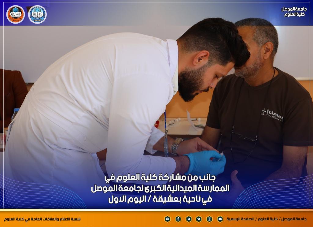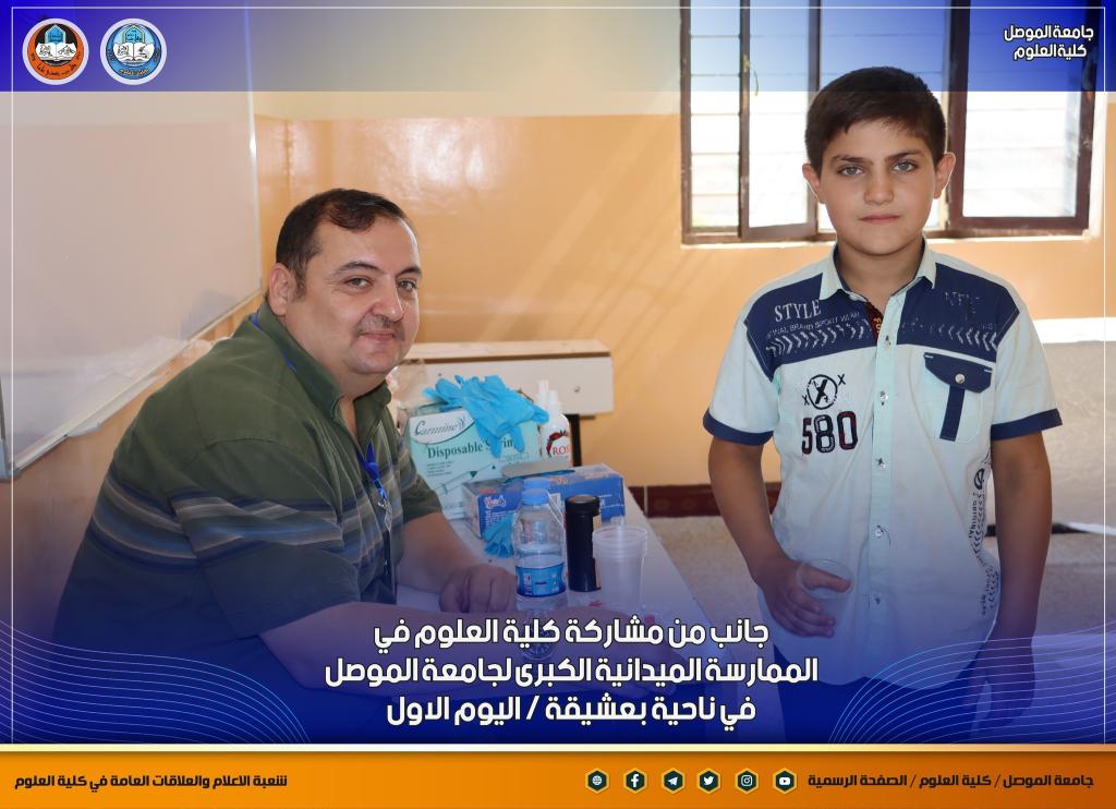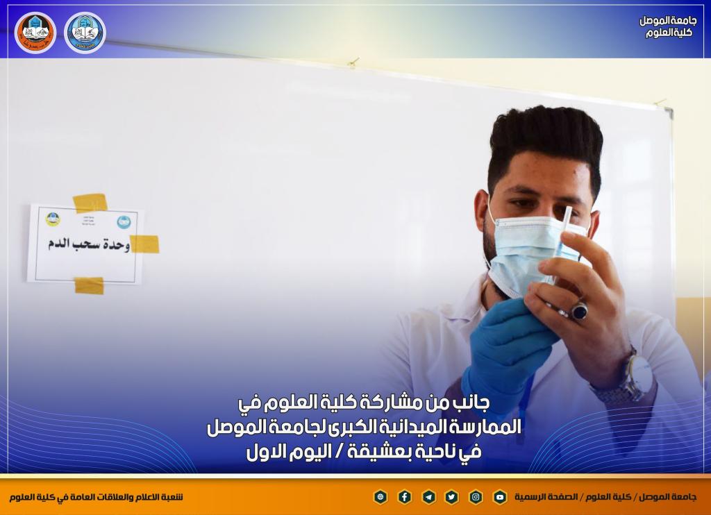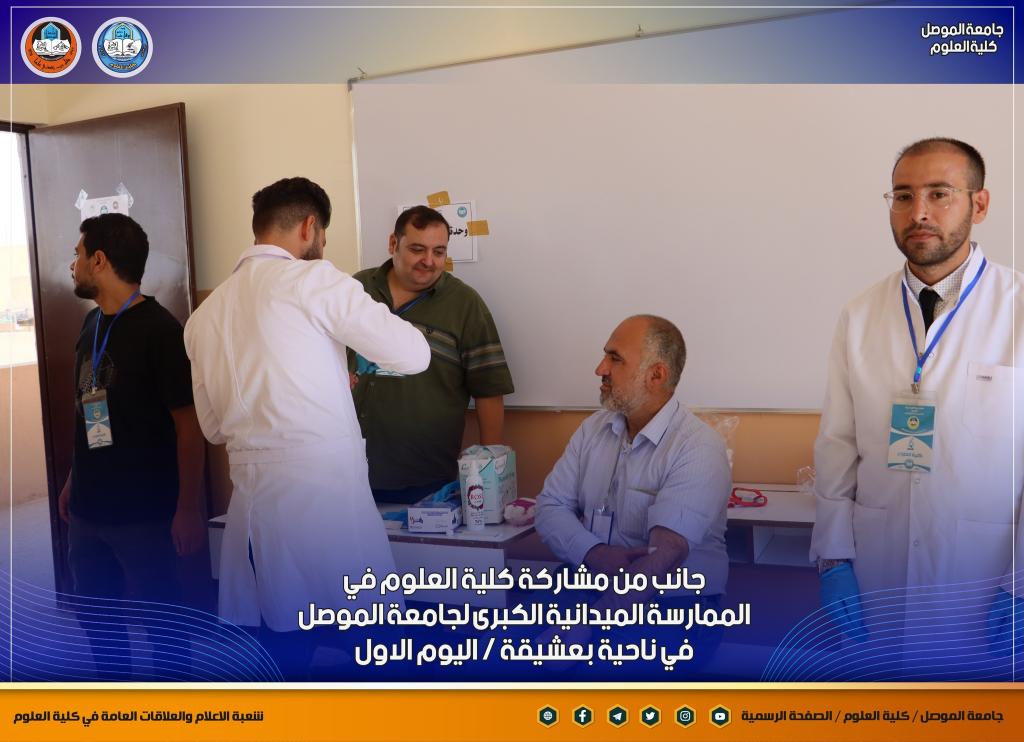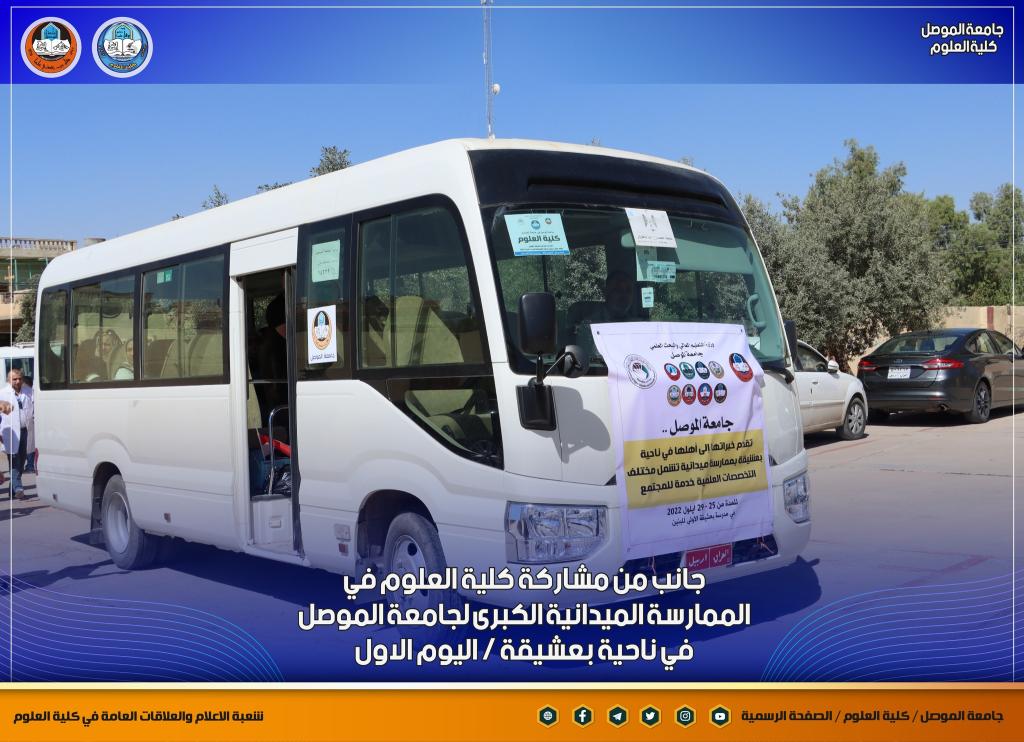 تحت شعار ” الجامعة في خدمة المجتمع ” و برئاسة و حضور السيد رئيس جامعة الموصل الأستاذ الدكتور قصي كمال الدين الأحمدي المحترم و السيد مساعد رئيس الجامعة للشؤون العلمية الأستاذ الدكتور منير سالم طه المحترم و السيد مدير ناحية بعشيقة السيد ذنون يونس المحترم ، انطلقت أعمال الممارسة الميدانية الكبرى لجامعة الموصل في ناحية بعشيقة و ضواحيها يوم الأحد الموافق 25 أيلول 2022 بمشاركة عدداً من كليات الجامعة.وقد ترأس الوفد المشارك لكلية العلوم في هذه الممارسة السيدة العميد الأستاذ الدكتورة هيام عادل إبراهيم المحترمة ، تجلّت الخدمات التي قدمتها الكلية في اليوم الأول بإجراء الفحوصات الطبية المجانية للمراجعين مع اجراء مسح ميداني للمياه المتوفرة في منطقة الممارسة و اجراء الفحوصات المتعلقة بها للتأكد من سلامتها و صلاحيتها للاستخدام ، كذلك اجري مسح ميداني لأشجار المنطقة لمعاينة الاصابات المختلفة عليها ، كما تضمنت أعمال اليوم الأول كذلك قياس نسبة الاشعاع في المنطقة.تأتي هذه المشاركة لتؤكد على دور الكلية في خدمة المجتمع و استمراراً للمشاركات السابقة للكلية في مناطق مختلفة من مدينة الموصل و ضواحيها.جدير بالذكر أن أعمال الممارسة تستمر الى يوم الخميس المقبل 29 أيلول 2022.شعبة الاعلام والعلاقات العامةالأحد 25 أيلول 2022