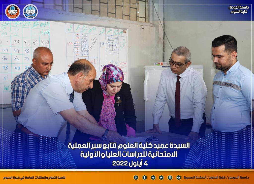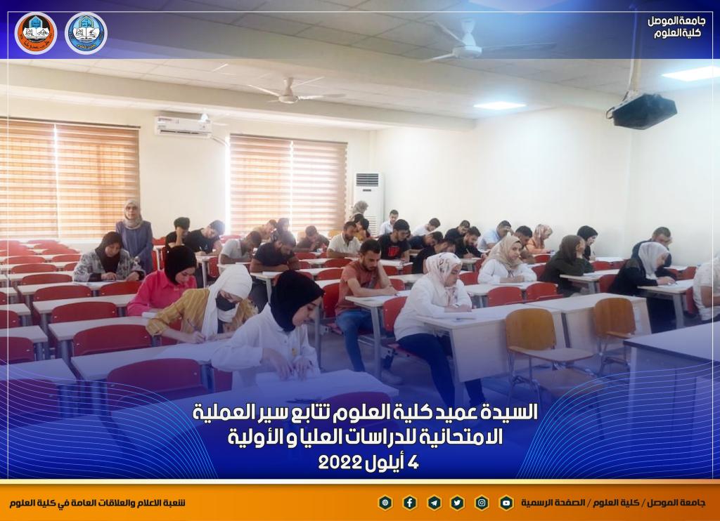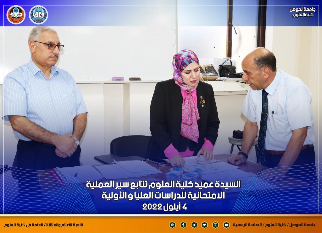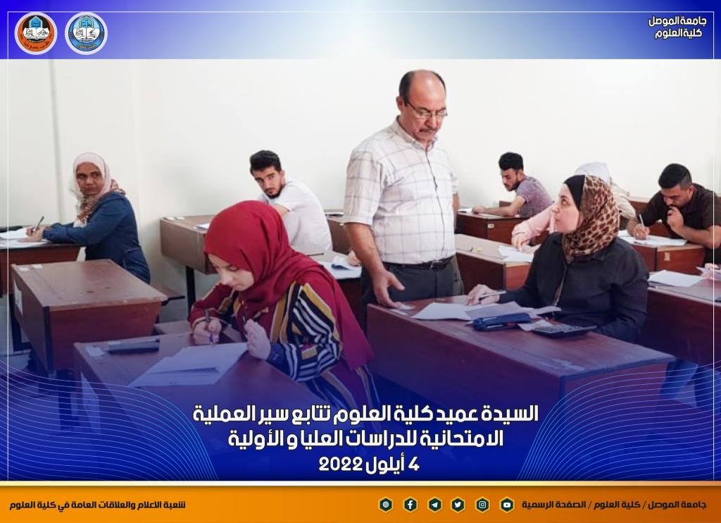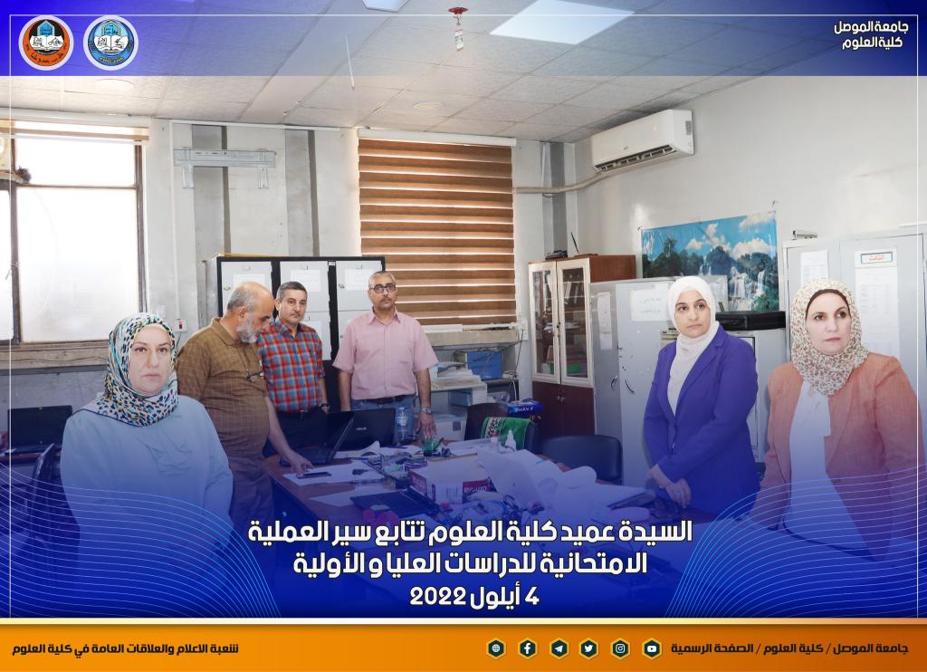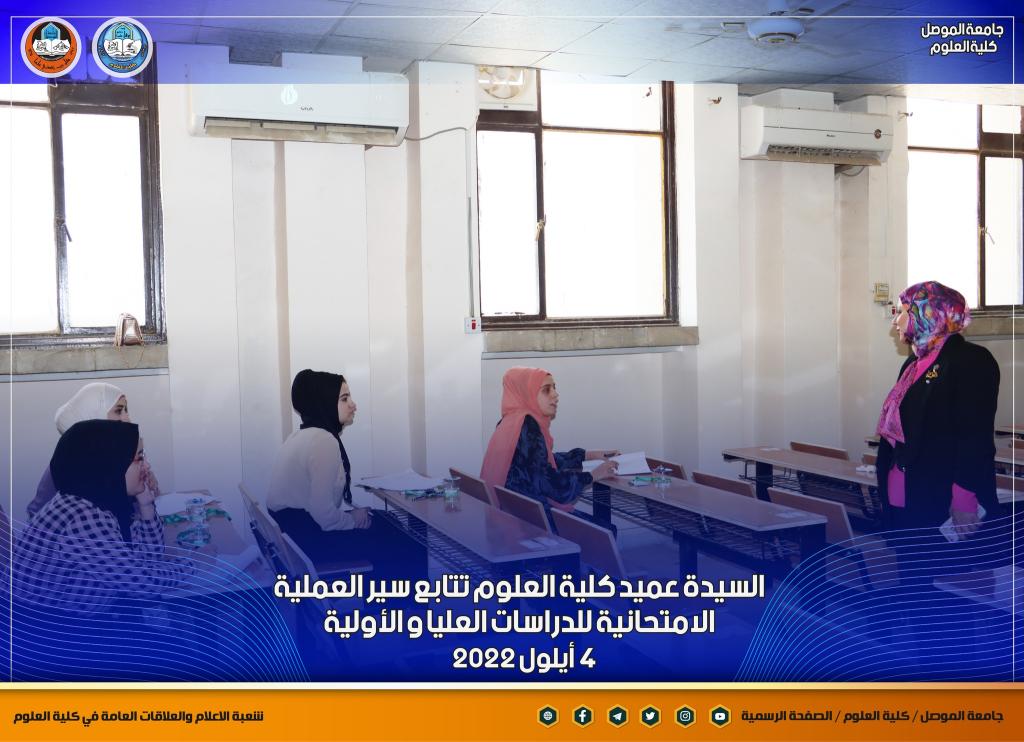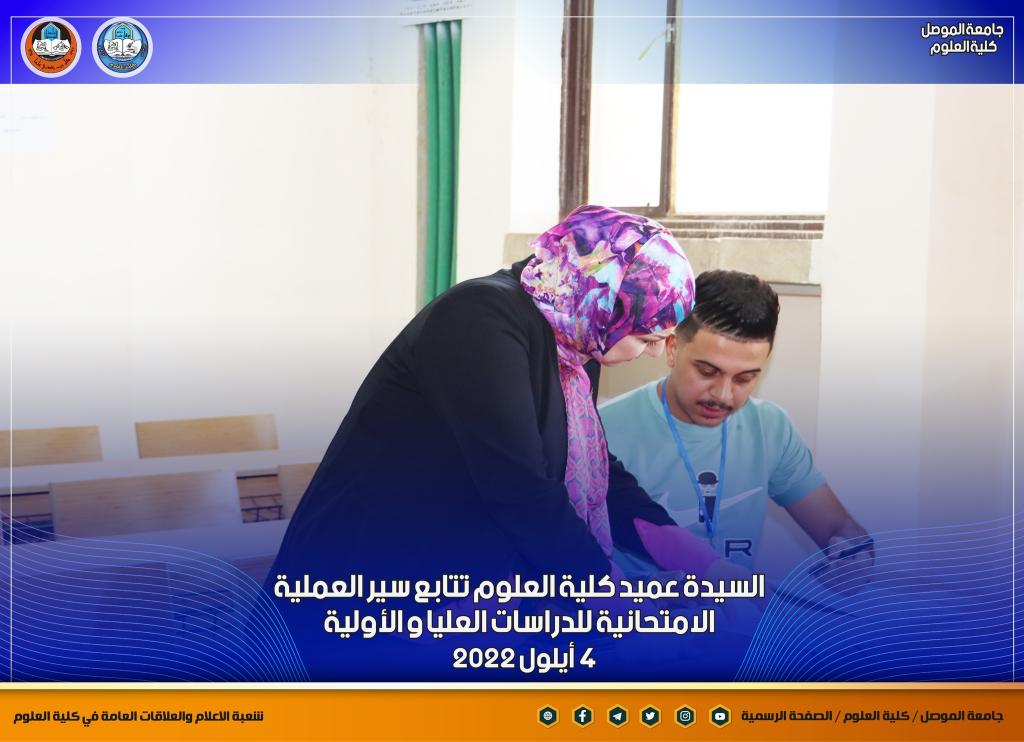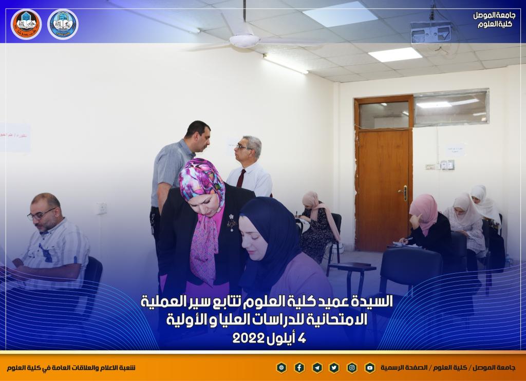 انطلقت صباح يوم الأحد الموافق 4 أيلول 2022 الامتحانات النهائية / الدور الثاني للعام الدراسي 2021-2022 للدراستين العليا و الأولية ، و جولة تفقدية للسيدة العميد الأستاذ الدكتورة هيام عادل إبراهيم يرافقها السادة معاوني العميد لمتابعة سير العملية الامتحانية في أقسام الكلية.شعبة الاعلام والعلاقات العامةالأحد 4 أيلول 2022