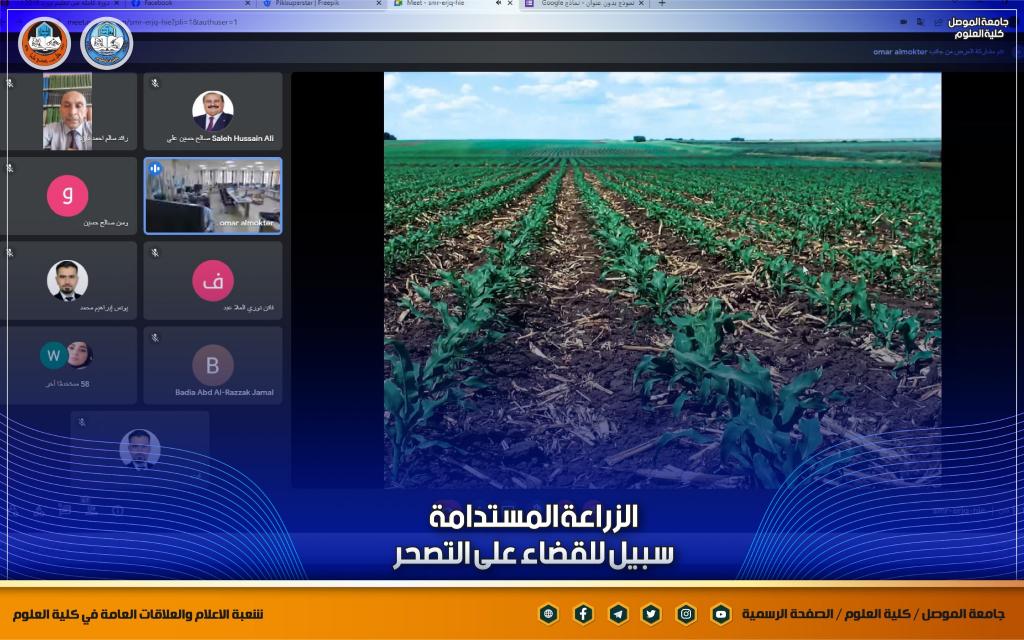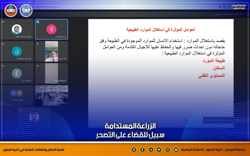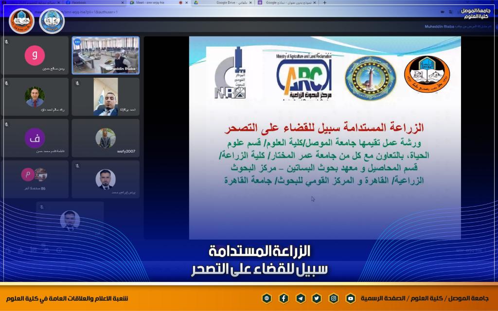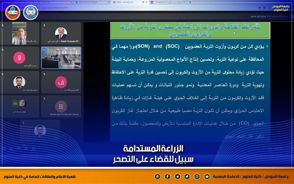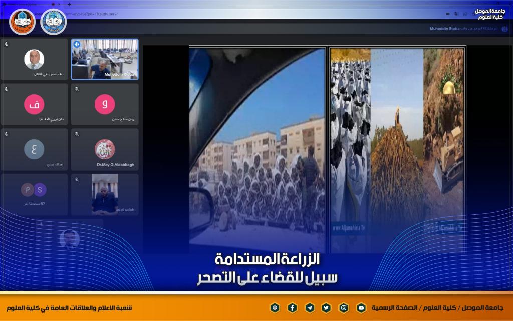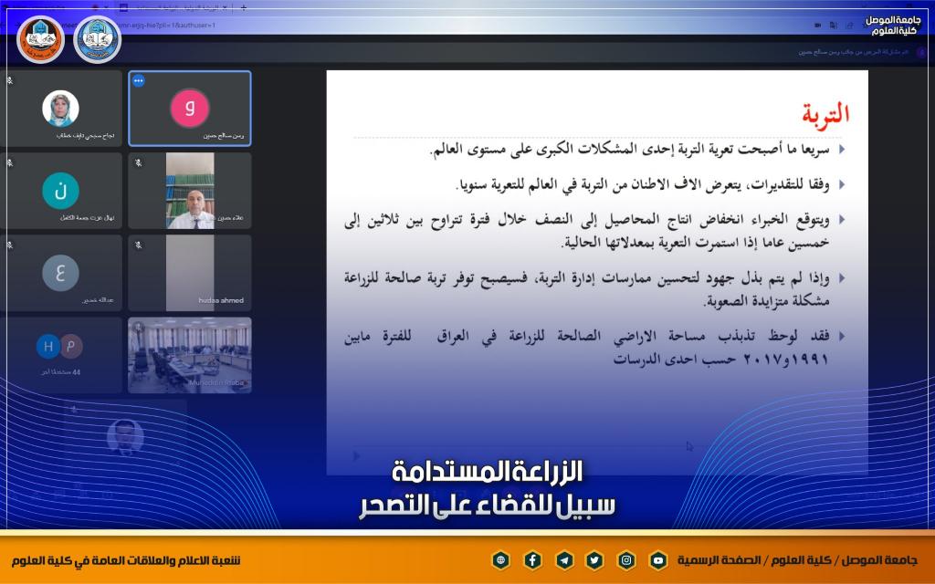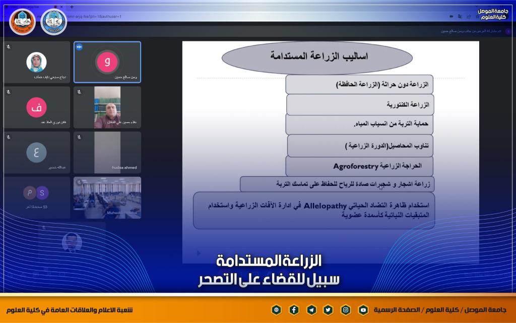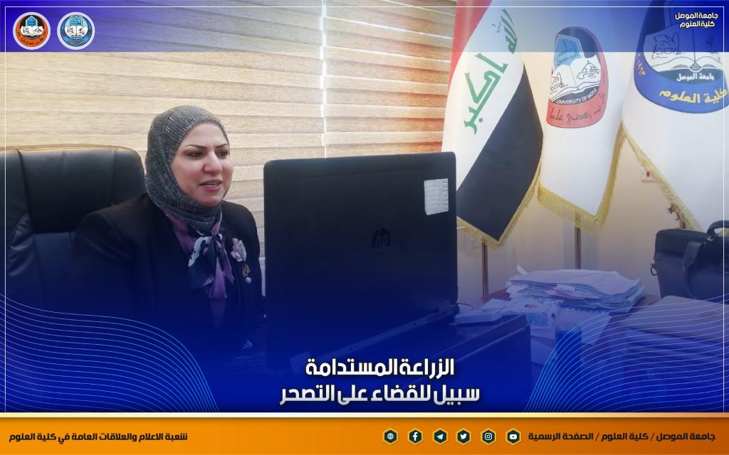 استناداً الى توجيهات وزارة التعليم العالي والبحث العلمي و برعاية كريمة من لدن السيد رئيس جامعة الموصل الأستاذ الدكتور قصي كمال الدين الأحمدي وبإشراف وحضور السيدة العميد الأستاذ الدكتورة هيام عادل إبراهيم ، أقام قسم علوم الحياة و بمتابعة ومشاركة السيد رئيس القسم الأستاذ المساعد الدكتور رائد سالم الصفار ورشة عمل دولية تحت عنوان :”الزراعة المستدامة سبيل للقضاء على التصحر”حاضر في الورشة التي أتت لتوكد على برنامج التنمية المستدامة الذي تنتهجه كلية العلوم نخبة من أعضاء هيأة التدريس بقسم علوم الحياة بمشاركات علمية قيمة بالتعاون مع قسم المحاصيل بكلية الزراعة جامعة عُمر المختار ، و معهد بحوث البساتين- مركز البحوث الزراعية القاهرة ، و المركز القومي للبحوث / القاهرة ( مرفق طيا ) .دارت أحداث الورشة للفترة من 19-21 تموز 2022 الكترونياً باستخدام منصة Google meet. وفي ختام أعمالها خرجت بالعديد من التوصيات لمكافحة التصحر وخلق زراعة مستديمة تُحافظ على البيئة وتدعم الأمن الغذائي ، أبرزها :1- توعية وارشاد المزارعين بمفهوم واهمية الزراعة المستدامة ودورها بمكافحة التصحر .2- منع قطع الأشجار والشجيرات وعدم التعدي على الغطاء النباتي و سن قوانين من شأنها وضع حد رادع للعابتين بالغطاء النباتي .٣-زراعة مصدات الرياح وتغطية سطح التربة خاصة في الأراضي الرملية للحد من التعرية وزحف الرمال .4- الاهتمام بالمحاصيل التي تتحمل الملوحة والعمل على استنباط و أقلمة أنواع جيدة منها في المناطق المعرضة للملوحة .5- اتباع نظام الدورات الزراعية المناسبة لمنع تدهور الأراضي الزراعية وحمايتها من التلوث.6- استخدام تقنية الاستشعار عن بعد في حصر المساحات المصابة بالأمراض والحشرات للتقليل من استخدام المبيدات الكيماوية.٧- اتباع الطرق السليمة في الري والصرف وتجنب الري بالغمر.٨-تنظيم الرعي بصورة تضمن حماية الغطاء النباتي .٩-استخدام الأسمدة العضوية الحيوية بديلا عن الأسمدة الكيماوية حفاظا على التربة والبيئة من التلوث .10 – اتباع نظام الزراعة المتداخلة لزيادة إنتاجية المحاصيل و محاولة خلق توازن بين الإنتاج الزراعي والصناعي وتحقيق عائد مادي للمزارع بدون حدوث فجوة غذائية .١١- اتباع أسلوب المكافحة الحيوية للقضاء علي الحشرات.حضر الورشة كذلك عدد من تدريسي وطلبة الكلية والجامعة ، اضافة الى عدد من الجامعات العراقية و العربية.