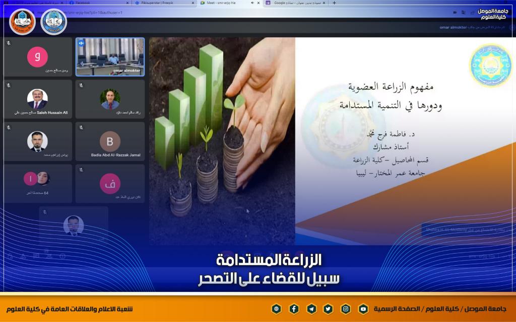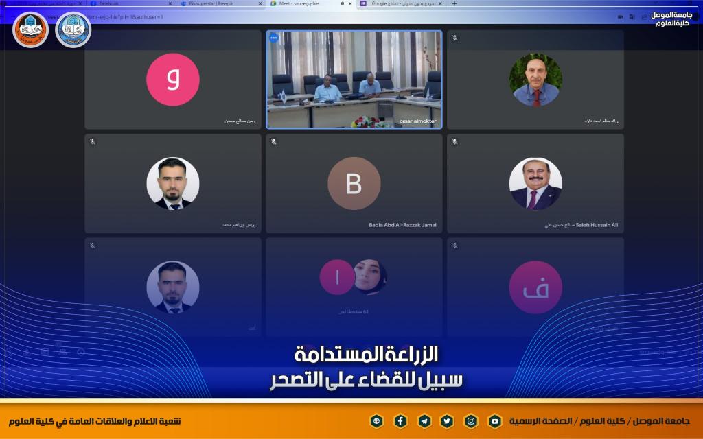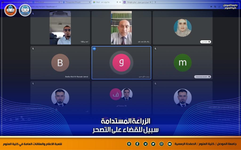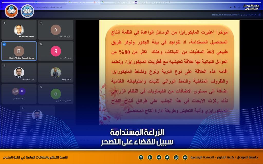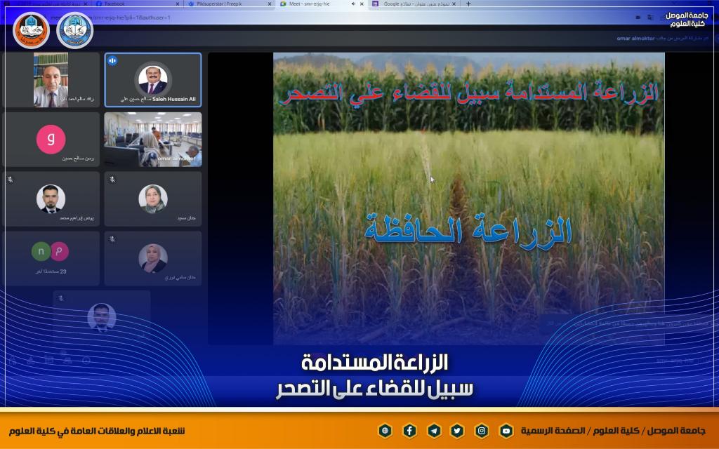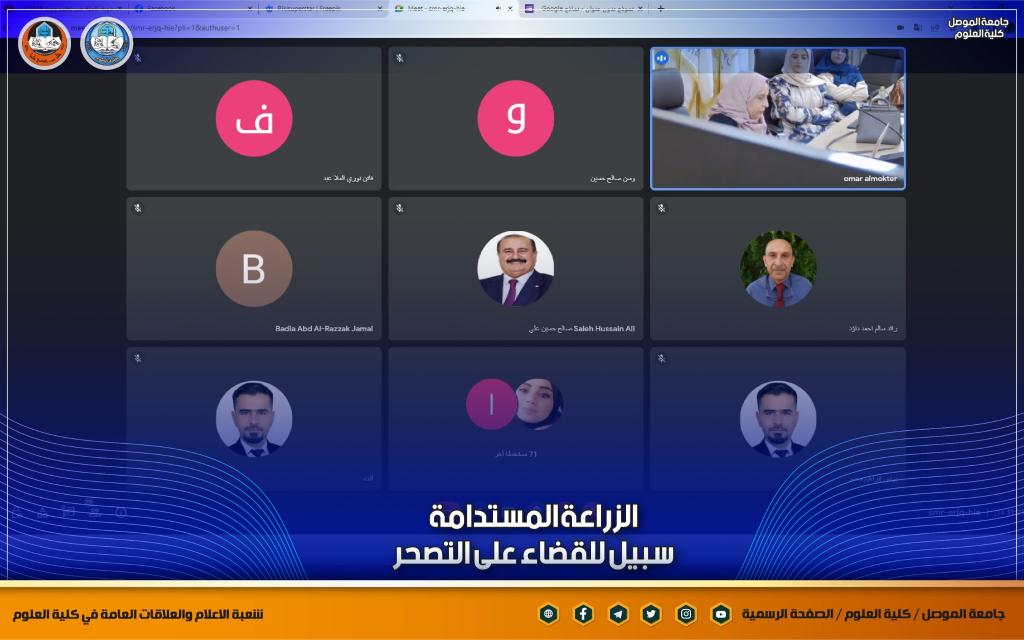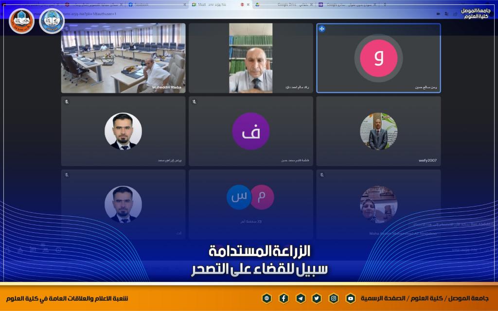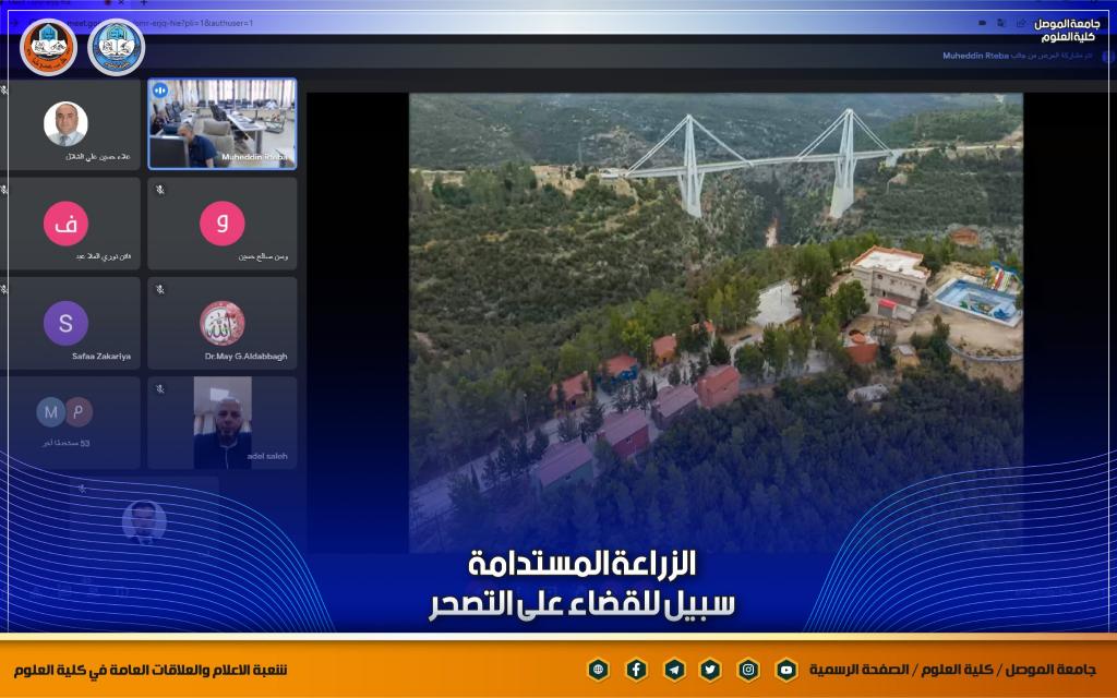 استناداً الى توجيهات وزارة التعليم العالي والبحث العلمي و برعاية كريمة من لدن السيد رئيس جامعة الموصل الأستاذ الدكتور قصي كمال الدين الأحمدي وبإشراف وحضور السيدة العميد الأستاذ الدكتورة هيام عادل إبراهيم ، أقام قسم علوم الحياة و بمتابعة ومشاركة السيد رئيس القسم الأستاذ المساعد الدكتور رائد سالم الصفار ورشة عمل دولية تحت عنوان :”الزراعة المستدامة سبيل للقضاء على التصحر”حاضر في الورشة التي أتت لتوكد على برنامج التنمية المستدامة الذي تنتهجه كلية العلوم نخبة من أعضاء هيأة التدريس بقسم علوم الحياة بمشاركات علمية قيمة بالتعاون مع قسم المحاصيل بكلية الزراعة جامعة عُمر المختار ، و معهد بحوث البساتين- مركز البحوث الزراعية القاهرة ، و المركز القومي للبحوث / القاهرة ( مرفق طيا ) .دارت أحداث الورشة للفترة من 19-21 تموز 2022 الكترونياً باستخدام منصة Google meet. وفي ختام أعمالها خرجت بالعديد من التوصيات لمكافحة التصحر وخلق زراعة مستديمة تُحافظ على البيئة وتدعم الأمن الغذائي ، أبرزها :1- توعية وارشاد المزارعين بمفهوم واهمية الزراعة المستدامة ودورها بمكافحة التصحر .2- منع قطع الأشجار والشجيرات وعدم التعدي على الغطاء النباتي و سن قوانين من شأنها وضع حد رادع للعابتين بالغطاء النباتي .٣-زراعة مصدات الرياح وتغطية سطح التربة خاصة في الأراضي الرملية للحد من التعرية وزحف الرمال .4- الاهتمام بالمحاصيل التي تتحمل الملوحة والعمل على استنباط و أقلمة أنواع جيدة منها في المناطق المعرضة للملوحة .5- اتباع نظام الدورات الزراعية المناسبة لمنع تدهور الأراضي الزراعية وحمايتها من التلوث.6- استخدام تقنية الاستشعار عن بعد في حصر المساحات المصابة بالأمراض والحشرات للتقليل من استخدام المبيدات الكيماوية.٧- اتباع الطرق السليمة في الري والصرف وتجنب الري بالغمر.٨-تنظيم الرعي بصورة تضمن حماية الغطاء النباتي .٩-استخدام الأسمدة العضوية الحيوية بديلا عن الأسمدة الكيماوية حفاظا على التربة والبيئة من التلوث .10 – اتباع نظام الزراعة المتداخلة لزيادة إنتاجية المحاصيل و محاولة خلق توازن بين الإنتاج الزراعي والصناعي وتحقيق عائد مادي للمزارع بدون حدوث فجوة غذائية .١١- اتباع أسلوب المكافحة الحيوية للقضاء علي الحشرات.حضر الورشة كذلك عدد من تدريسي وطلبة الكلية والجامعة ، اضافة الى عدد من الجامعات العراقية و العربية.