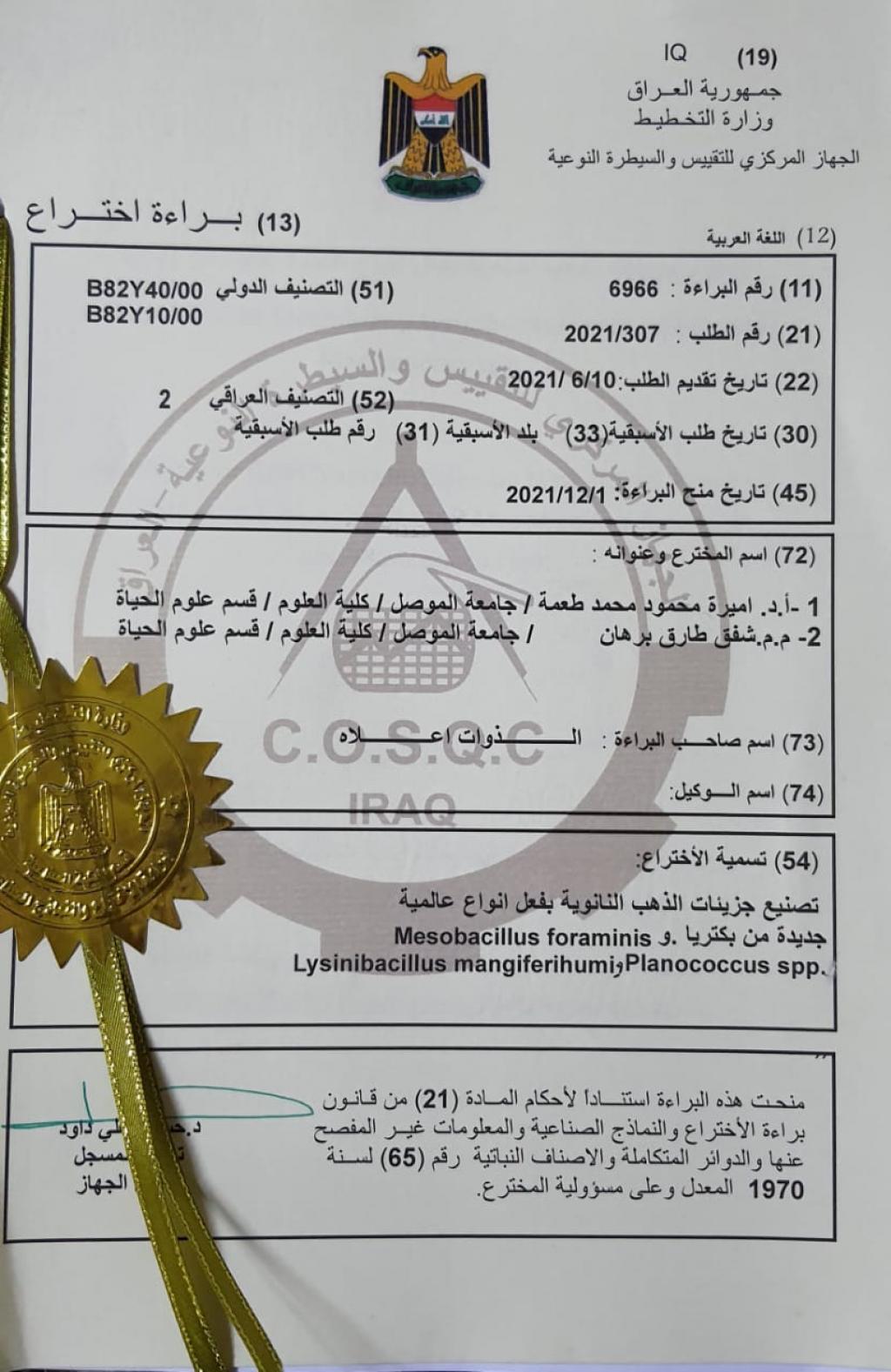 يستمر الإبداع العلمي لتدريسي كلية العلوم فقد تسلمت الأستاذ الدكتورة أميرة محمود الراوي والدكتورة شفق طارق برهان في قسم علوم الحياة على براءة اختراع جديدة من رئيس الجهاز المركزي للتقييس والسيطرة النوعية في بغداد يوم الخميس الموافق 2 كانون الأول 2021 .تضمنت البراءة ثلاثة محاور أساسية : حيث تضمن المحور الأول عزل وتشخيص خمسة أنواع من البكتريا التي لها القابلية على تخليق جسيمات الذهب النانوية وأظهرت النتائج أن ثلاثة منها أثبتتا قدرتها على تخليق الذهب النانوي لأول مرة محلياً وعالمياً فيما شمل المحور الثاني تحوير الوسط المستخدم للعزل لأول مرة عالمياً أما المحور الثالث تضمن استخدام المجهر الفلورسيني في التوصيف المظهري لجسيمات الذهب النانوي .نبارك للدكتورة اميرة والدكتورة شفق هذا التميز العلمي مع تمنياتنا لتدريسي كلية العلوم التقدم العلمي المستمر.