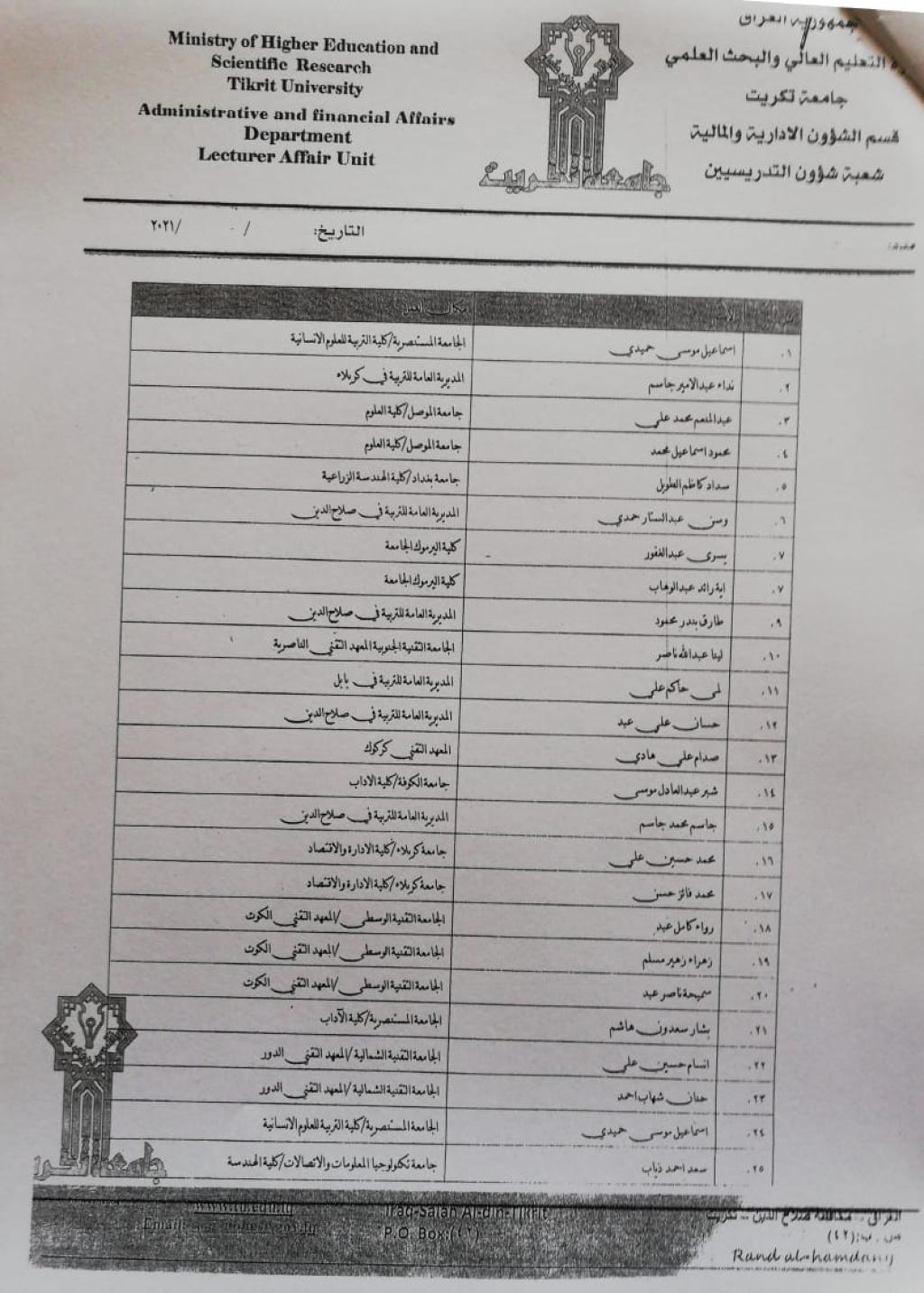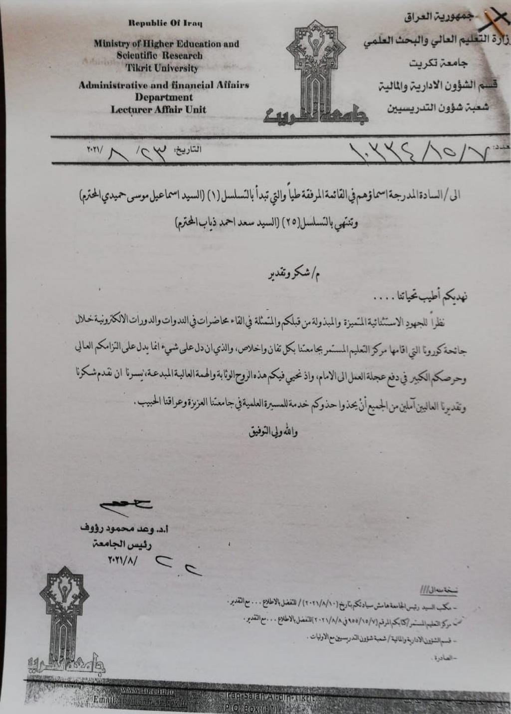 تدريسيان من كلية العلوم يحصلان على كتاب شكر و تقدير من جامعة تكريت