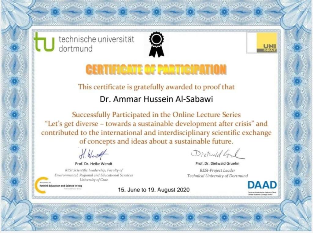 شارك كل من أ.م.د.صهباء علي أحمد و أ.م.د. عمار حسين السبعاوي من قسم الكيمياء بحضور عدد من المحاضرات في التعليم المستمر عبر التعليم الإلكتروني مع جامعة دورتموند التقنية الألمانية و كانت تحت عنوان ” دعنا نتنوع نحو تنمية مستدامة بعد الأزمات ” و قد ألقيت من خلالها العديد من المحاضرات من قبل عدد من المحاضرين و التي جرت للفترة من 15حزيران – 14تموز/2020 في جزئها الأول و للفترة من 16تموز – 19أب /2020 في جزئها الثاني .