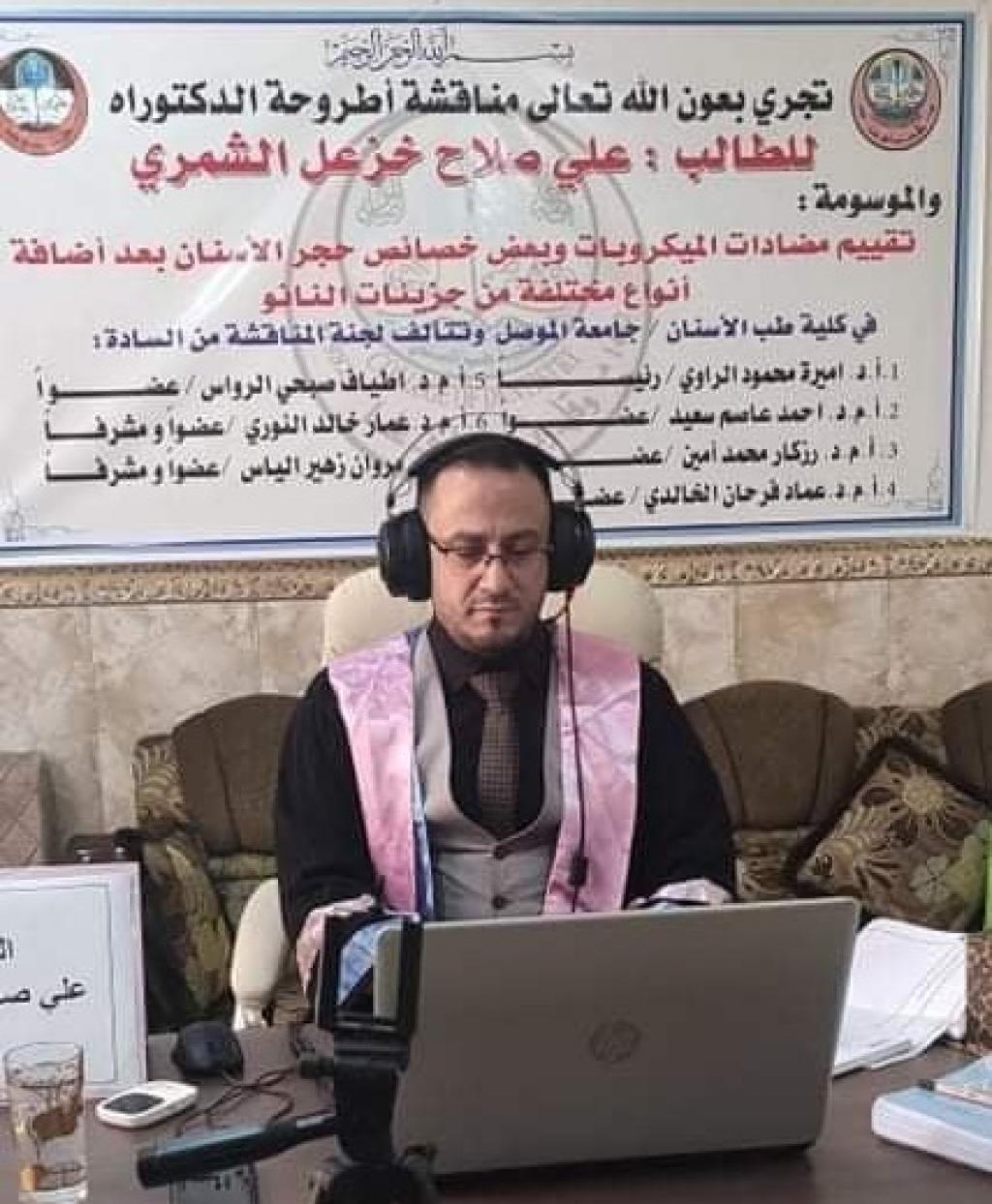 جرت صباح يوم الاثنين الموافق 2020/6/1 عبر الفضاء الالكتروني باستخدام منصة Google meet و بحضور الأستاذ الدكتورة ( أميرة محمود الراوي ) من قسم علوم الحياة رئيساً و حضور الدكتور مروان زهير إلياس رئيس قسم الفيزياء الحياتية عضواً و مشرفاً مناقشة أطروحة الدكتوراه للطالب ( علي صلاح خزعل الشمري
