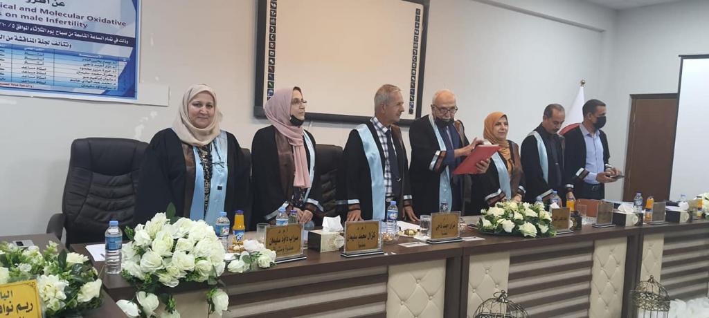 ضمن النشاطات العلمية لتدريسي كليتنا ، أشرفت الأستاذ المساعد الدكتورة سراب داؤد سليمان التدريسية في قسم علوم الحياة على أطروحة الدكتوراه الموسومة :effect of some biochemical and molecular oxidative Stress factors on male infertilityللطالبة ريم نواف الصواف في كلية التربية للعلوم الصرفة قسم الكيمياء حيث جرت المناقشة في صباح يوم الثلاثاء الموافق 5 أكتوبر 2021 ،حيث حصلت الطالبة على درجة الإمتياز مع تمنياتنا لأساتذة كلية العلوم بالتقدم العلمي المستمر.