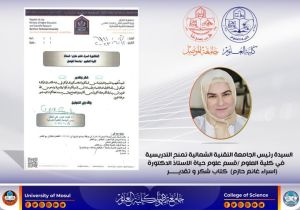 منحت السيدة رئيس الجامعة التقنية الشمالية الأستاذ الدكتورة علياء عباس علي العطار المحترمة كتاب شكر و تقدير الى الأستاذ الدكتورة إسراء غانم حازم التدريسية في قسم علوم الحياة بكليتنا ؛ بالنظر لجهودها المبذولة وتفانيها في أداء الأعمال الموكلة لها في لجنة الترقيات العلمية.