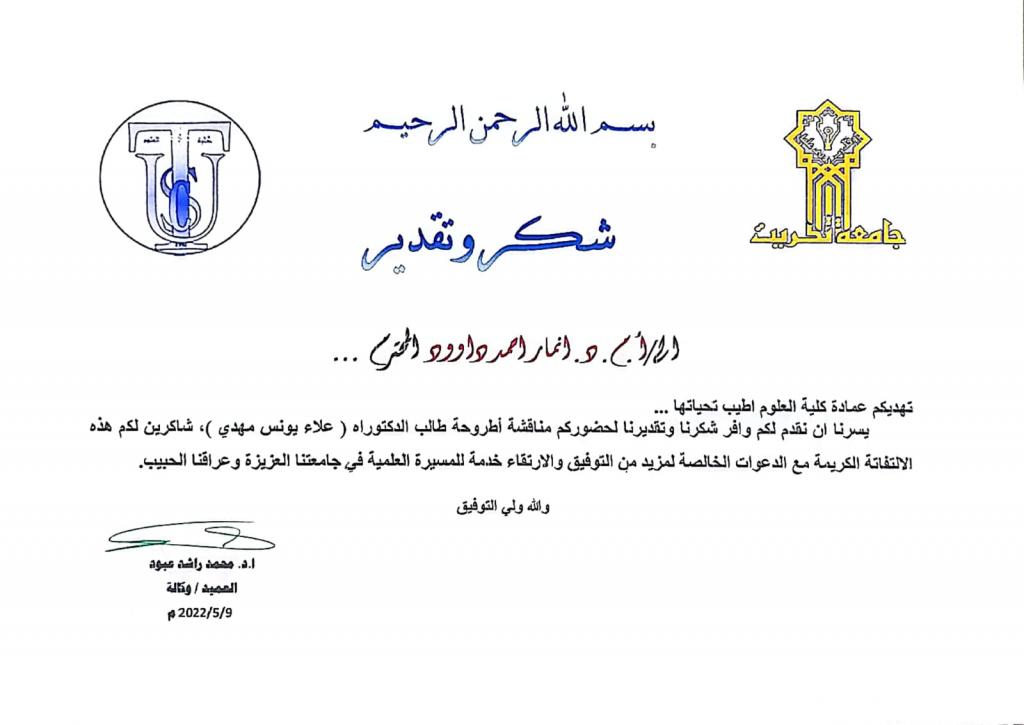 تدريسي في قسم علوم الحياة عضواً في لجنة مناقشة في كلية العلوم/جامعة تكريت