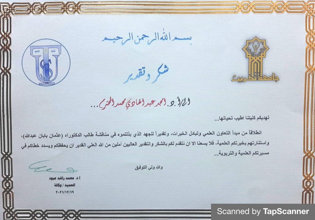 ضمن النشاطات العلمية لتدريسيي كليتنا شارك الأستاذ الدكتور أمجد عبد الهادي التدريسي في قسم علوم الحياة عضواً لمناقشة أطروحة الدكتوراه للطالب (عثمان بابان عبد الله) في كلية العلوم/جامعة تكريت يوم الأحد الموافق 19 كانون الأول 2021 وحصل على كتاب شكر من عمادة كلية العلوم جامعة تكريت لتكبده عناء السفر ومناقشة الطالب.مع تمنياتنا لأساتذة كلية العلوم بالتقدم العلمي المستمر.