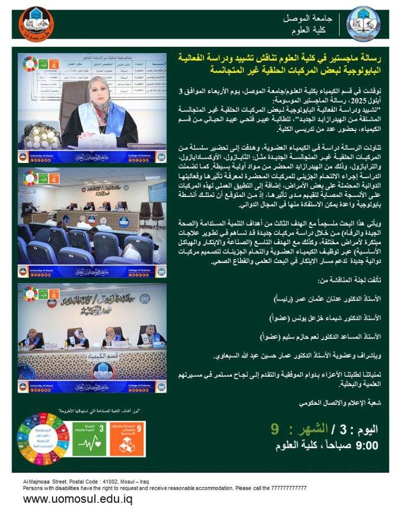 جرت أحداث المناقشة صباح يوم الثلاثاء الموافق 26 آب 2025 في رحاب قاعة المناقشات بكلية العلوم في جامعة تكريت، بحضور أعضاء اللجنة والطلبة.