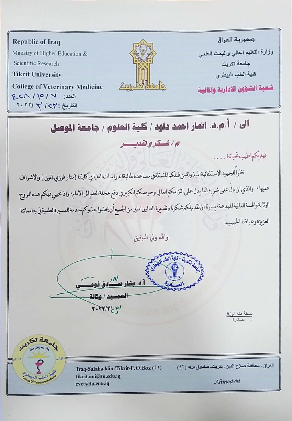 حصل الأستاذ المساعد الدكتور ( أنمار أحمد داؤود ) التدريسي في قسم علوم الحياة على كتاب شكر وتقدير من كلية الطب البيطري/ جامعة تكريت تثميناً لجهوده المبذولة في الإشراف على طالبة الماجستير ( منار فوزي ذنون ) .نبارك له هذا التقدم العلمي مع تمنياتنا لكافة تدريسي كلية العلوم التقدم والعطاء خدمة للصالح العام .
