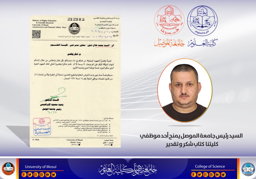 تدريسي من كلية العلوم يحصل على كتاب شكر وتقدير من السيد رئيس جامعة الموصل المحترم