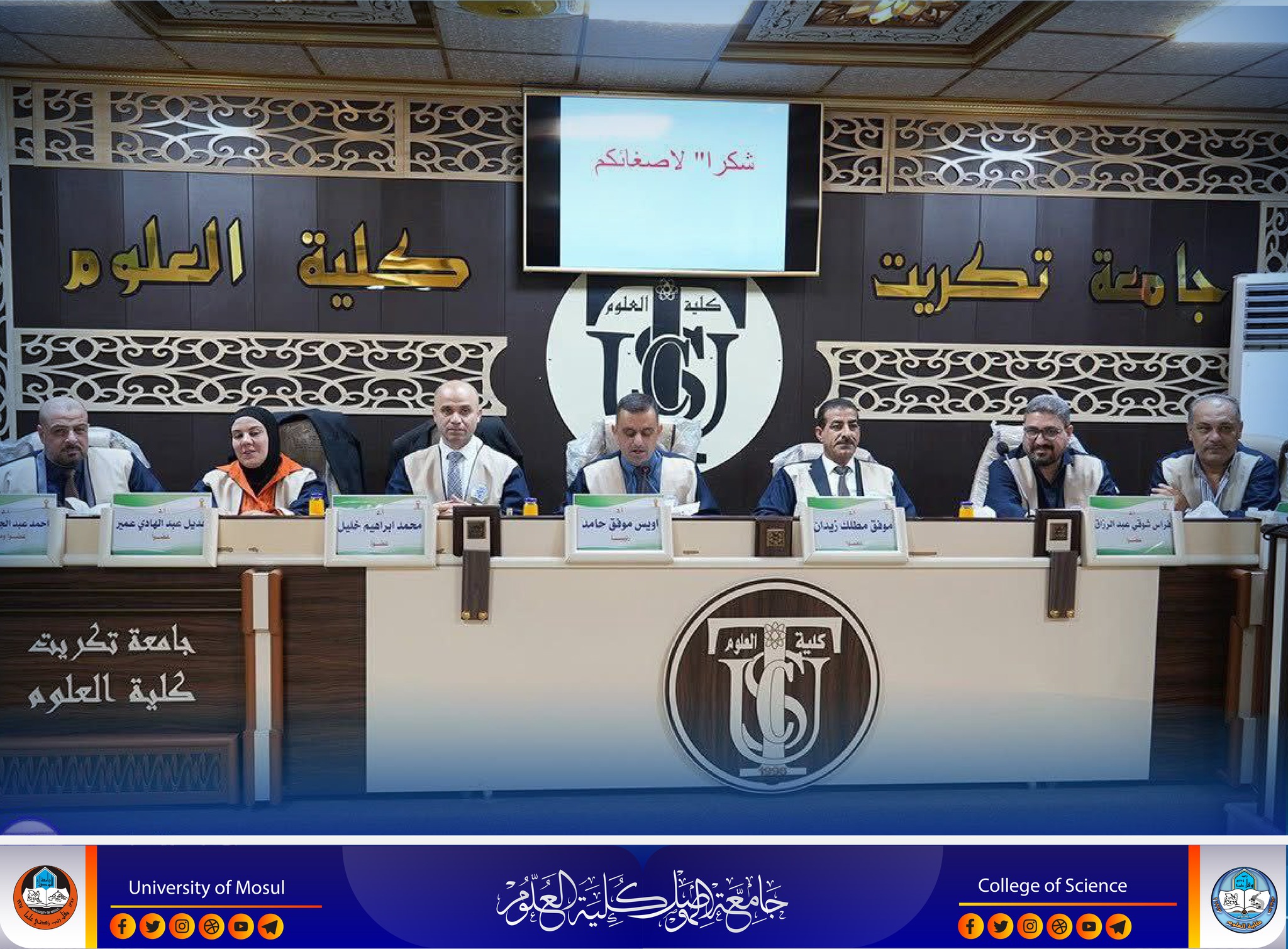 جرت وقائع المناقشة صباح يوم الثلاثاء الموافق 24 حزيران 2025، على قاعة المناقشات في كلية العلوم – جامعة تكريت، بحضور نخبة من الأساتذة والباحثين.