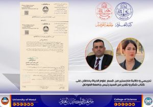 تدريسي وطالبة ماجستير من كليتنا يحصلان على كتاب شكر وتقدير من السيد رئيس جامعة الموصل