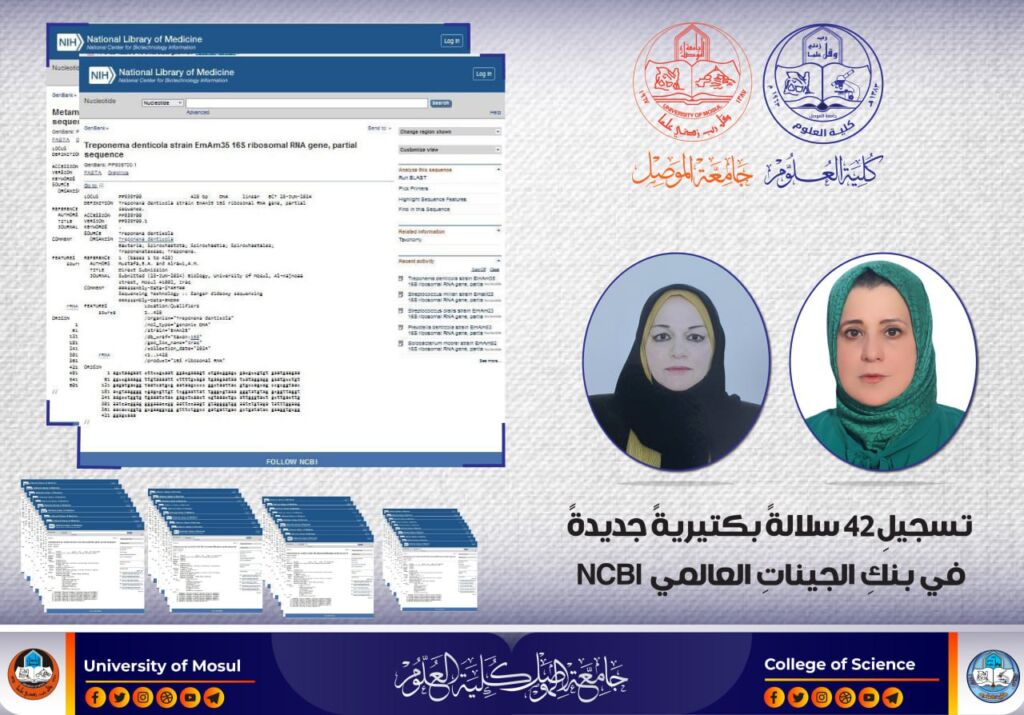 في بادرةٍ علميَّةٍ تُضاف إلى إنجازات كُليَّة العلوم، قامت كلٌّ من التدريسيَّة في قسم علوم الحياة الأستاذ المساعد الدكتور أنفال مؤيَّد جلال الدين، وطالبتَي المرحلة الرابعة دينا مازن معتوق في الدراسة الصباحيَّة، وفاطمة حسن عبدالرحمن في الدراسة المسائيَّة، وضمن مشروع بحث تخرُّجهما، بتسجيل سُلالتين بكتيريَّتين محلِّيَّتين من بكتيريا Escherichia coli المعزولة من عينات الإدرار لمرضى يُعانون من التهابات المجاري البوليَّة، في المركز الوطني لمعلومات التقانة الحيويَّة NCBI تحت رمزي الانضمام: