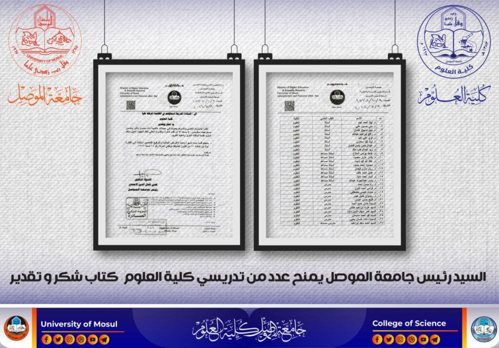 من جانب آخر تتقدم أسرة كلية العلوم متمثلةً بالسيدة العميد الأستاذ الدكتورة (هيام عادل إبراهيم الطائي) بخالص التهاني والتبريكات بمناسبة هذا الإنجاز العلمي الجديد، متمنيةً لهم مزيداً من التقدم والازدهار والرقي.