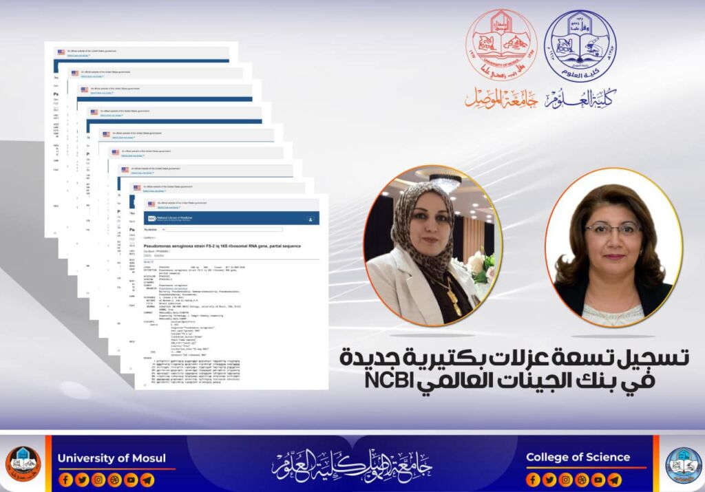 ضمن مشهد الإنجازات العلمية في كلية العلوم، سجل كل من الأستاذ المساعد الدكتور (أوس ابراهيم سليمان) والأستاذ المساعد الدكتورة (صبا عبدالسلام حامد) من كلية الطب / جامعة نينوى وطالبة الماجستير (تمارا زياد طارق) ست عزلات بكتيرية تعود لأجناس وأنواع مختلفة هي: عزلة واحدة من Morganella morganii وعزلتين من Corynebacterium striatum وعزلة واحدة من Pseudomonas aeruginosa وعزلة واحدة من Escherichia coli وعزلة واحدة من وStaphylococcus aureus في المركز الوطني لمعلومات التقانة الحيوية NCBI وحملت الرموز التالية: