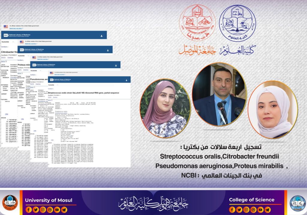 ضمن مشهد الانجازات العلمية في كلية العلوم، سجل كل من الاستاذ الدكتور امجد عبد الهادي محمد رئيس قسم علوم الحياة والطالبتين ابرار رياض عبد الغفور وسارة فيصل سالم ضمن مشروع تخرجهما سلالتين جديدة من الخمائر لأول مرة تابعة للجنس Saccharomyces في بنك الجينات العالمي التابع للمركز العالمي للتكنولوجيا الحيويةNCBI ، بالرمز