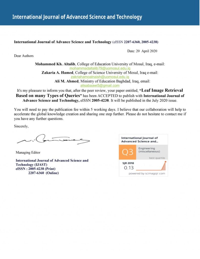 رسالة قبول بحث لتدريسي في مجلة ضمن مستوعبات سكوباس
