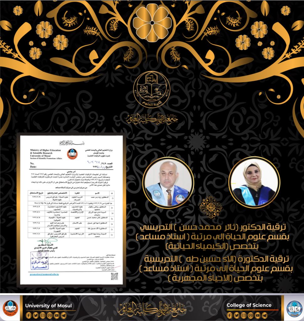 تتقدم كلية العلوم ممثلةً بالسيدة عميدة الكلية الاستاذ الدكتورة هيام عادل إبراهيم المحترمة بأبهى التبريكات الى أخوة الوطن من أبنائه الأيزيديين بمناسبة عيد الصوم.. راجية لهم دوام الأمن والاستقرار في مدينتنا وربوع عراقنا العظيم، وأن يعود والجميع ينعمون بالألفة والمحبة والتكاتف من أجل بناء الوطن ودفع حركة التقدم والتطور فيه إلى الأمام.