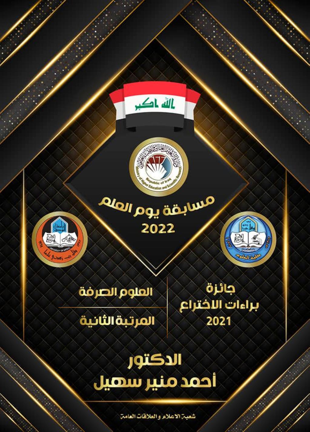 للتألق و التميز والابداع عنوان.. و جامعتنا الغراء و كليتنا العريقة أهل له…جامعتنا المعطاء تنال المرتبة الأولى على الجامعات العراقية و كلية العلوم تحصد المرتبة الأولى على جامعة الموصل مناصفة مع كلية الطب البيطري في مسابقة يوم العلم 2022 بواقع (5 جوائز) .فقد أعلنت وزارة التعليم العالي و البحث العلمي عن نتائج مسابقة يوم العلم 2022 ، وكان لكلية العلوم في جامعة الموصل حضور مرموق على كليات الجامعة و الكليات المناظرة في الجامعات العراقية ، حيث حصدت خمسة جوائز توزعت على فئات متنوعة في المسابقة و كالآتي :1- جائزة براءات الاختراع و الملكية الفكرية المميزة :- المرتبة الأولى (سنة النشر 2020) ذهبت الى التدريسية في قسم علوم الحياة الأستاذ الدكتورة أميرة محمود محمد الراوي.- المرتبة الثانية (سنة النشر 2021) حصل عليها التدريسي بقسم الفيزياء الدكتور أحمد منير سهيل.1- جائزة الكتاب المؤلف أو المترجم المميز :- المرتبة الأولى (سنة النشر 2020) حاز عليها التدريسي بقسم الكيمياء الأستاذ الدكتور رباح علي خليل.- المرتبة الأولى (سنة النشر 2021) حصل عليها التدريسي بقسم الفيزياء الطبية الأستاذ المساعد الدكتور محمود زكي سليمان الحسو.- المرتبة الثالثة ( سنة النشر 2021) حصلت عليها التدريسية بقسم الكيمياء الأستاذ الدكتورة زينة عبد المنعم الجوادي.بدورها تتقدم أسرة كلية العلوم ممثلة بالسيدة العميد الأستاذ الدكتورة هيام عادل ابراهيم بأحر التهاني و أجمل التباريك الى راعي مؤسسة جامعة الموصل الأستاذ الدكتور قصي كمال الدين الأحمدي المحترم و الى منتسبي كليتنا الأفاضل الذين كان لهم حضور متميز في سماء البحث العلمي على مستوى الجامعات العراقية ، متمنين لهم كل التوفيق و التقدم و العطاء خدمة لبلدنا العزيز.جامعتنا.. فخرناكليتنا… دائما الى الاماممبارك للجميعشعبة الإعلام والعلاقات العامةالاربعاء 25 كانون الثاني 2023