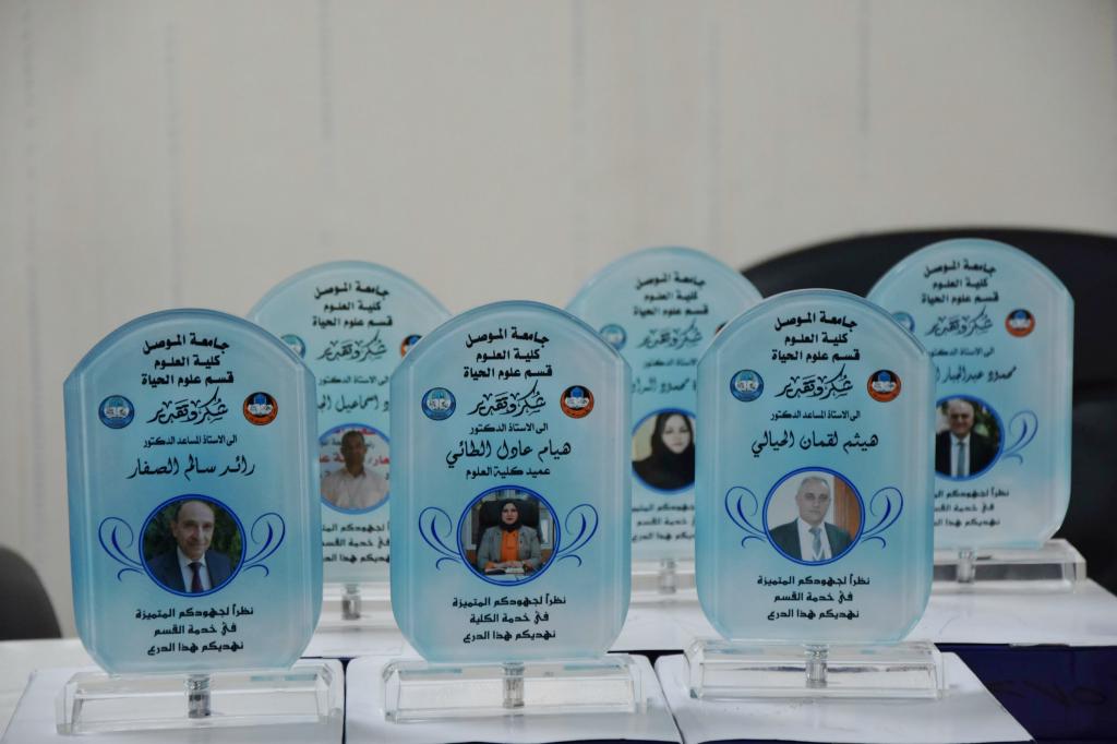 برعايةٍ كريمة من لدن السيدة عميد كلية العلوم الأستاذ الدكتورة هيام عادل الطائي المحترمة وحضور السيد رئيس قسم علوم الحياة الأستاذ المساعد الدكتور رائد سالم الصفار وتدريسيي القسم ، أقام قسم علوم الحياة في كلية العلوم صباح يوم الثلاثاء الموافق 28 حزيران 2022حفل تكريم و عرفان و وفاء لنخبة من منتسبي القسم المحالين على التقاعد حيث رحبت السيدة العميد بالسادة المتقاعدين وأثنت على الجهود المتميزة لهم خلال فترة عملهم في القسم وساهموا مع زملائهم بكل جِدٍّ في خدمة منظومة كلية العلوم وتحقيق النجاحات التي كان لها الأثر الطيب لدى الطلبة الخريجين وما تكريمكم اليوم إلا وفاء وعرفاناً بالجميل وتقديراً لجهودكم المبذولة .كما احتفى القسم بتكريم السادة التدريسيين الحاصلين على لقب الأستاذية وباركت السيدة عميد الكلية لهم تميزهم العلمي وتمنت لجميع التدريسيين مسيرة علمية حافلة بالإنجازات العلمية وحضور متميز لكلية العلوم في مشهد الترقيات العلمية لجامعة الموصل العريقة .
