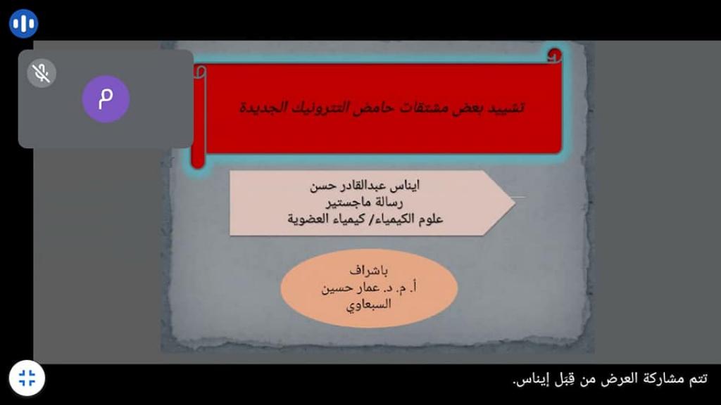 ضمن مجموعة الحلقات الدراسية في كلية العلوم والخاصة بطلبة الدراسات العليا و بمتابعة من قبل السيدة عميد كلية العلوم الأستاذ المساعد الدكتورة هيام عادل الطائي أقيم في قسم الكيمياء يوم الثلاثاء الموافق 13 تموز 2021 حلقتان دراسيتان :الحلقة الدراسية الأولى للطالب ( جاسم عبدالرزاق جاسم الجبوري ) بإشراف الأستاذ المساعد الدكتورة شيماء خزعل العزاوي عن رسالته الموسومة ” تحضير ودراسة طيفية لسلسلة جديدة من المركبات الحلقية غير المتجانسة نايتروجينية المحتوى” تناولت الدراسة ادخال مركب السلفاثايازول في أربع مسارات مختلفة ومتنوعة لتحضير أنواع مختلفة من المركبات الحلقية غير المتجانسة خماسية الحلقة .والحلقة الدراسية الثانية للطالبة ( إيناس عبدالقادر حسن )بإشراف أ.م.د. عمار حسين السبعاوي عن رسالتها الموسومة ” تشييد بعض مشتقات حامض التترونيك الجديدة ” حيث تضمنت الدراسة تحضير مشتق حامض التترونيك كما تضمنت ثلاث تفاعلات نيكلوفيلية مع مشتق حامض التترونيك لتحضير مشتقات حامض التترونيك الجديدة .