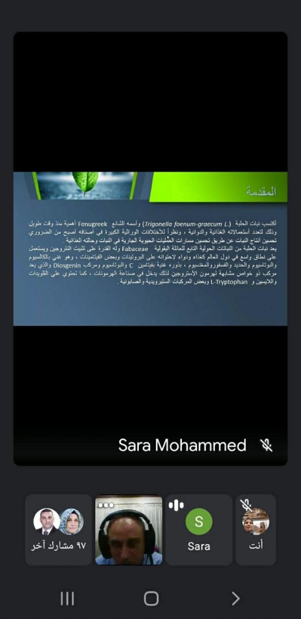 ضمن سلسلة النشاطات العلمية لقسم علوم الحياة وبحضور مقرر قسم علوم الحياة الدكتور هيثم لقمان شهاب القت طالبة الماجستير رشا محمد صالح حلقة دراسية بعنوان (تحفيز انبات نبات اللوسينيا leucaena leucocephala وتقدير بعض المركبات الفعالة منه باستخدام تقانة زراعة الأنسجة النباتية) باشراف الدكتورة ازهار حسين الشهواني كما القت طالبة الماجستير سارة محمد حمد حلقة دراسية بعنوان(دور حامض السالسليك في تحسين نمو وحاصل نبات الحلبة fenugreek والنامي تحت الجهد المائي) باشراف الدكتور علاء حسين الجبوري وذلك في تمام الساعه الثامنة من مساء يوم الاثنين المصادف 2021/2/8مع تمنياتنا لطلبتنا الأعزاء دوام الموفقية والنجاح.