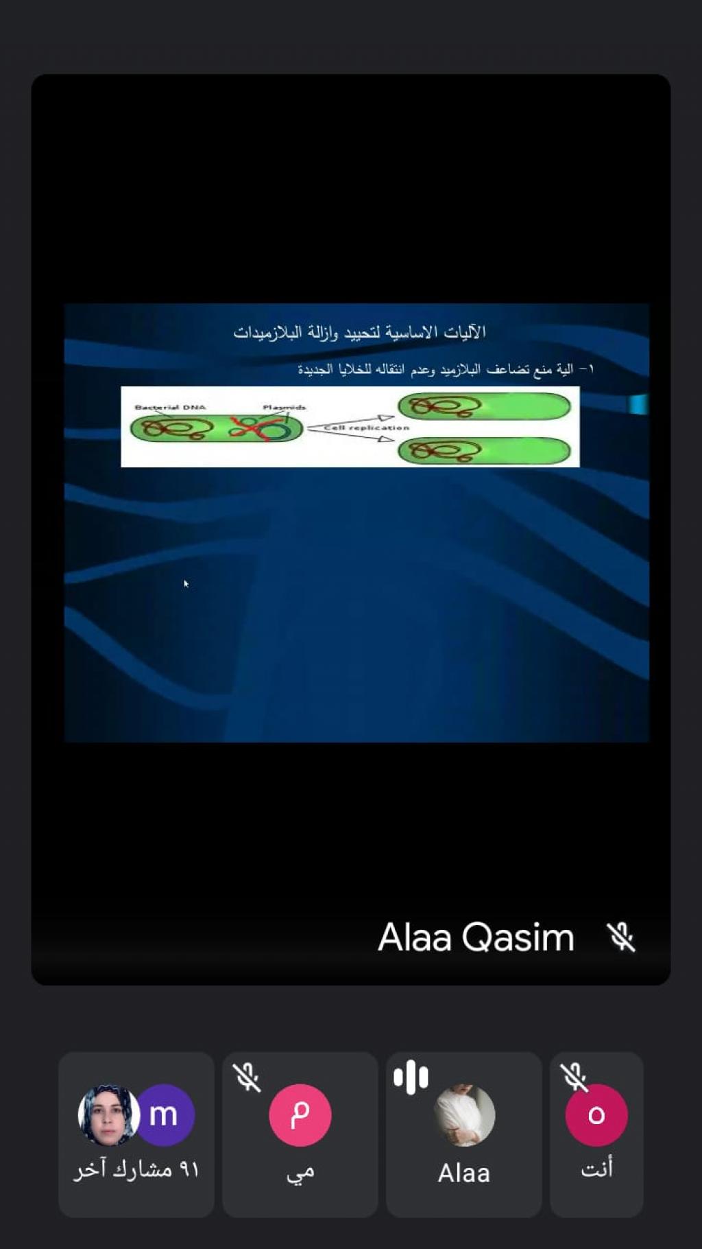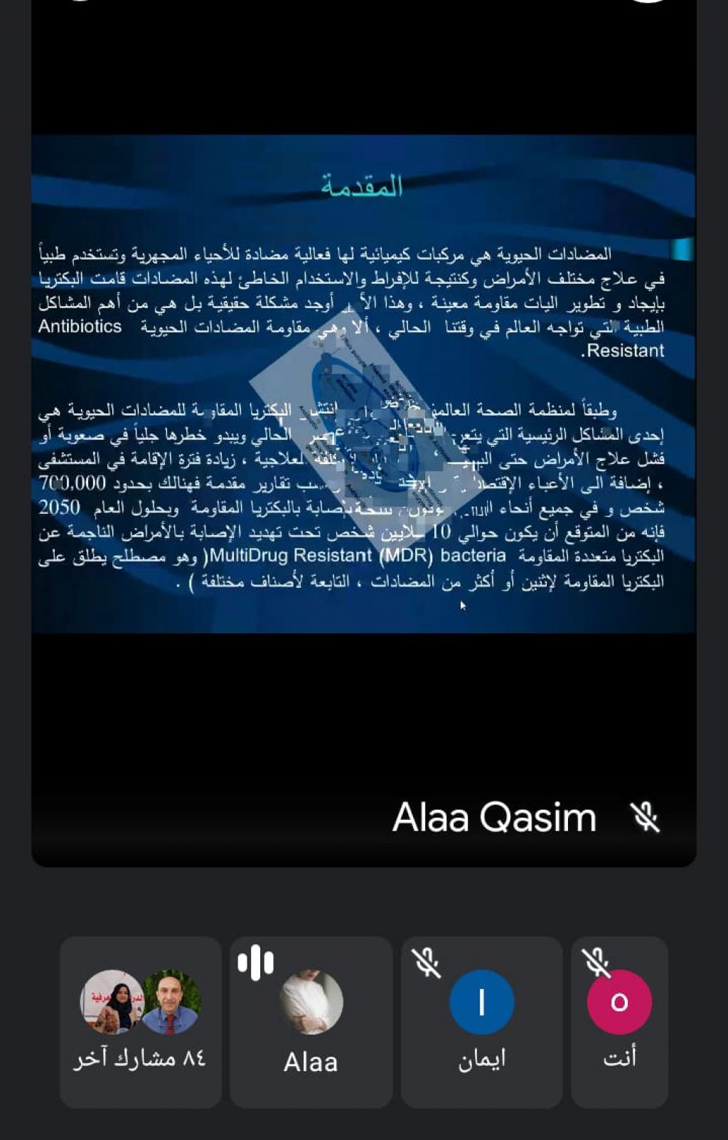 ضمن سلسلة النشاطات العلمية لقسم علوم الحياة وبحضور رئيس قسم علوم الحياة الاستاذ المساعد الدكتور رائد سالم الصفار القت طالبة الماجستير ألاء قاسم حيدر حلقة دراسية بعنوان (تقييم فعالية بعض المواد المضادة للبلازميدات ودورها في إزالة المقاومة البكتيرية للمضادات الحيوية) باشراف ا. د. محسن ايوب كما القت طالبة الماجستير إيناس وعد حلقة دراسية بعنوان(تقدير مستوى الاجسام المضادة لفايروس كورونا لدى المرضى المشافين في فترات مختلفة وعلاقتها مع بعض العوامل المناعية الاخرى ) باشراف ا. م. د. محمود عبد الجبار الطوبجي وذلك في تمام الساعه الثامنة من مساء يوم الاثنين المصادف 22 شباط 2021.مع تمنياتنا لطلبتنا الأعزاء دوام الموفقية والنجاح.