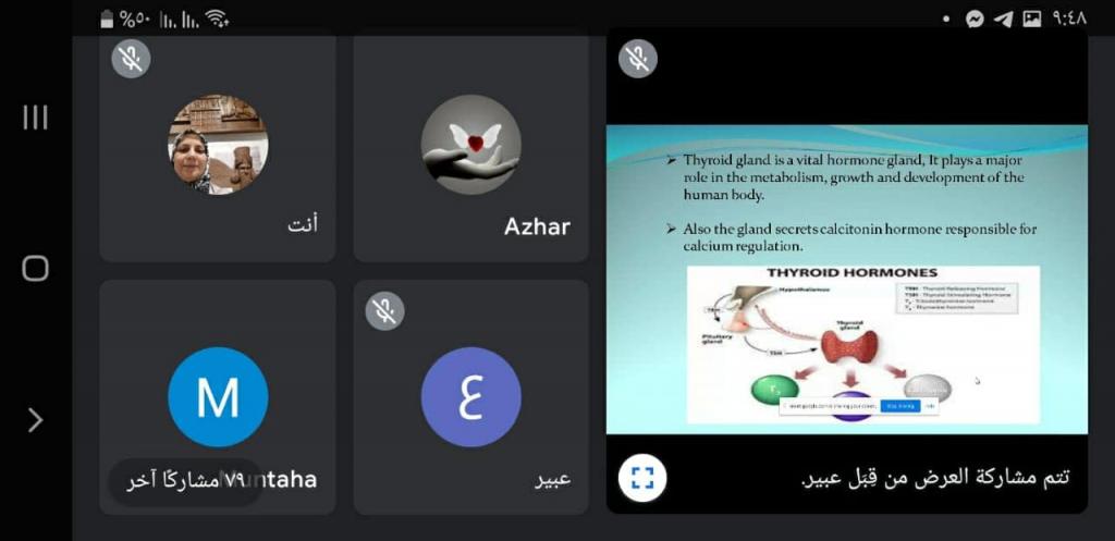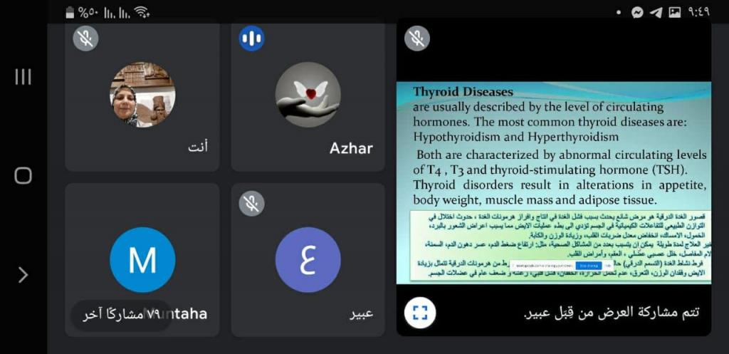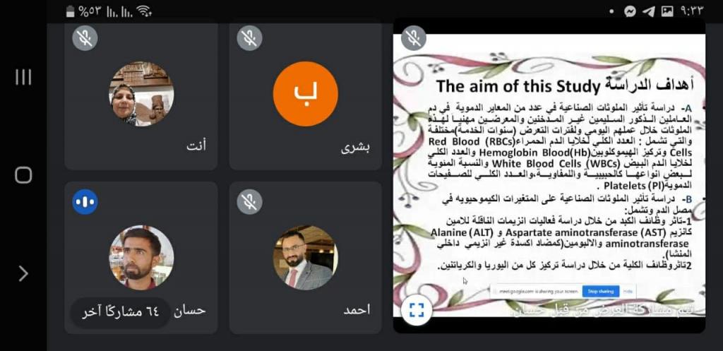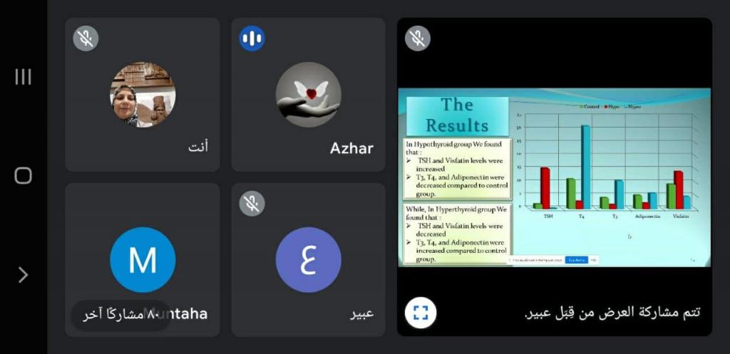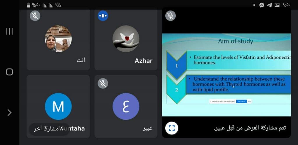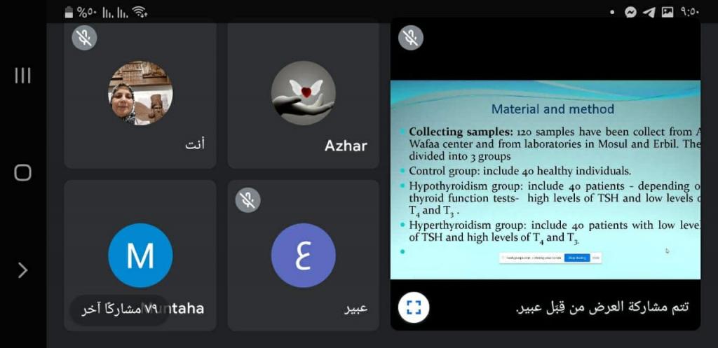 ضمن سلسلة النشاطات العلمية لقسم علوم الحياة و بحضور رئيس قسم علوم الحياة الأستاذ المساعد الدكتور رائد سالم الصفار القى طالب الماجستير حسان كزار حلقة دراسية عن رسالته الموسومة : ” تأثير الأجواء الصناعية على صحة العاملين في معمل سمنت بادوش الجديد” باشراف أ.د. منى حسين جانكير كما القت طالبة الماجستير أزهار يونس ذنون حلقة دراسية عن رسالتها الموسومة ” العلاقة بين بعض هرمونات النسيج الدهني مع زيادة ونقصان هرمونات الغدة الدرقية ” باشراف م. د. عبير عطا الله الحديدي في تمام الساعة التاسعة والنصف من مساء يوم الاثنين المصادف 14 حزيران 2021.مع تمنياتنا لطلبتنا الأعزاء دوام الموفقية والنجاح.