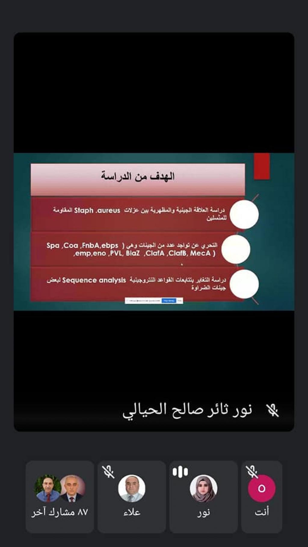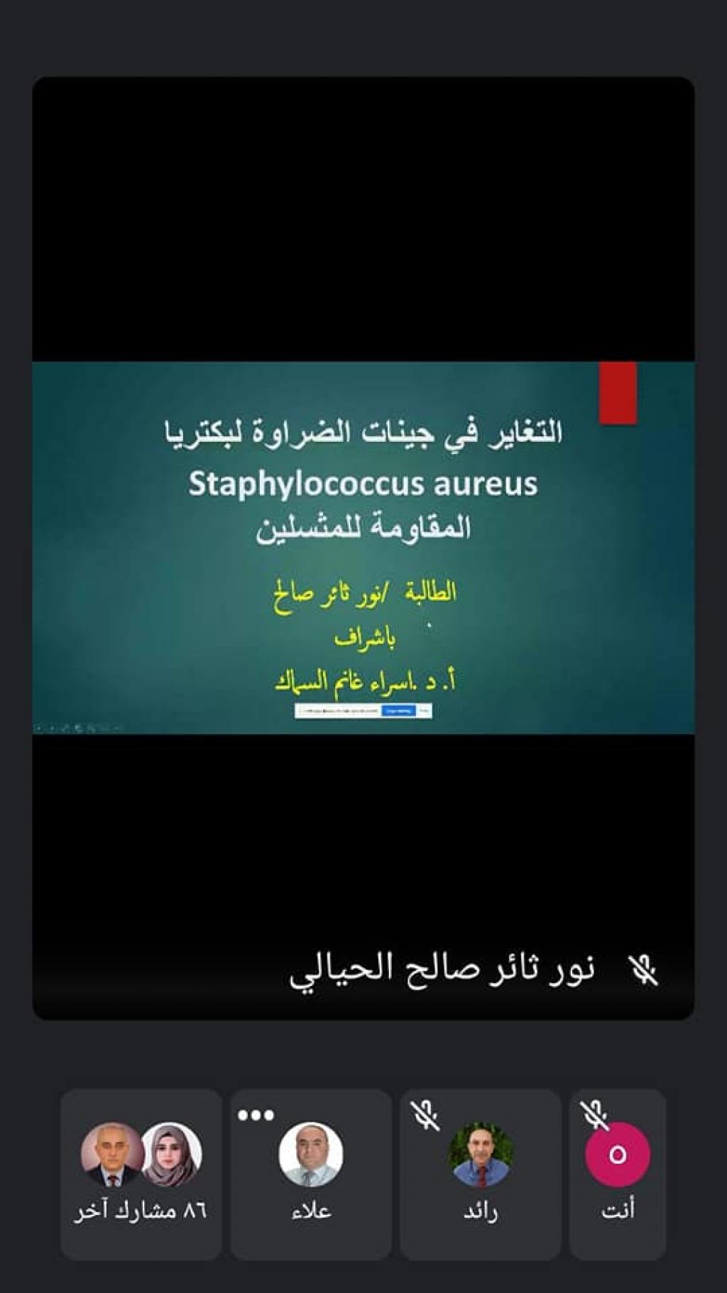 ضمن سلسلة النشاطات العلمية لقسم علوم الحياة وبحضور السيد رئيس قسم علوم الحياة الأستاذ المساعد الدكتور رائد سالم الصفار القت الطالبة ( نور ثائر صالح ) حلقة دراسية بعنوان ” التغاير في جينات الضراوة لبكتريا Staphylococcus aureus المقاومة للمثسلين ” باشراف أ.د. اسراء غانم السماك كما القت الطالبة ( إيناس منير ) حلقة دراسية بعنوان ” عزل وتشخيص بكتريا serratia spp. من مصادر سريرية مختلفة ” باشراف م. د. اوس ابراهيم وذلك في تمام الساعة الثامنة من مساء يوم الاثنين المصادف 15آذار 2021 .مع تمنياتنا لطلبتنا الأعزاء دوام الموفقية والنجاح.